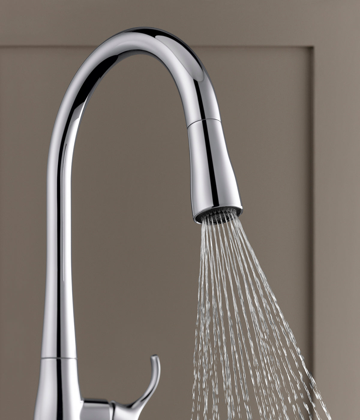 An innovative fit for a variety of kitchens and tasks, this Simplice kitchen faucet combines an elegant, universal design with exceptional ergonomics and functionality. The high-arch swing spout rotates 360 degrees, while the smoothly maneuvering sprayhead pulls down into the sink for up-close tasks, or out of the sink to fill pots. Sculpted buttons on the sprayhead ensure simple operation even with wet, soapy hands. Sweep spray creates a wide, forceful blade of water for superior cleaning. Kohler's new docking system, DockNetik, secures the pull-down sprayhead to the spout using magnetic force.