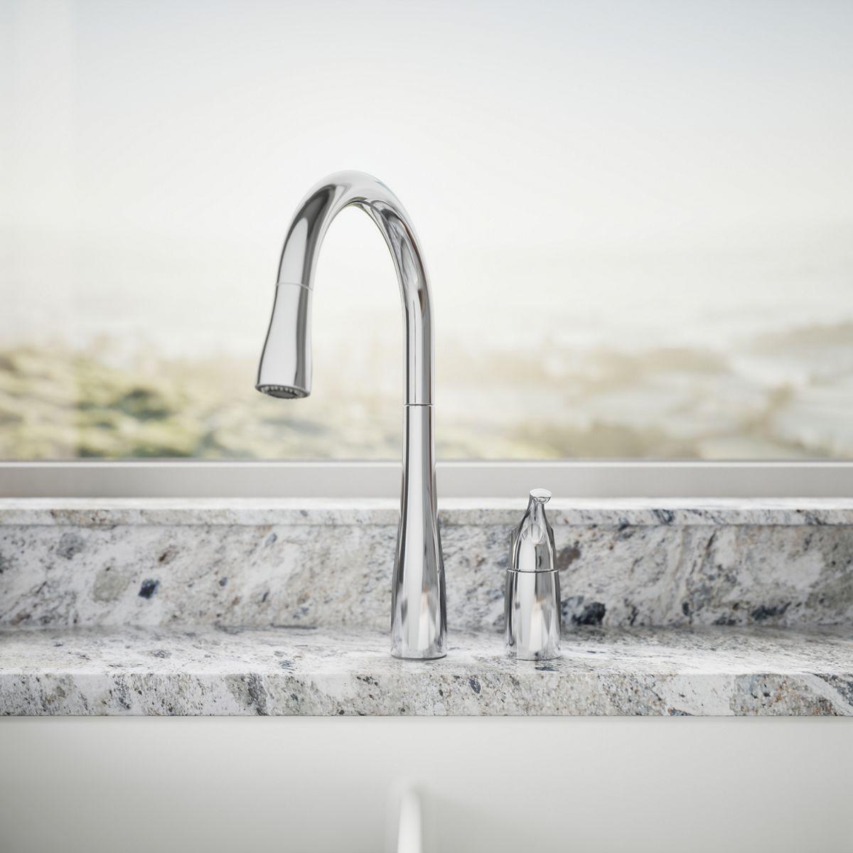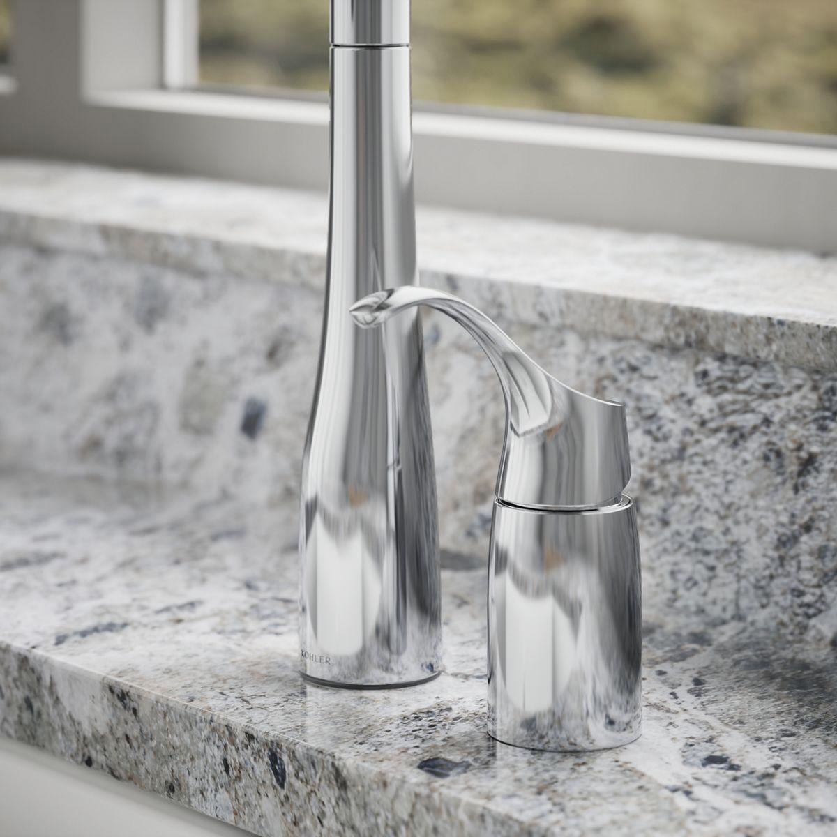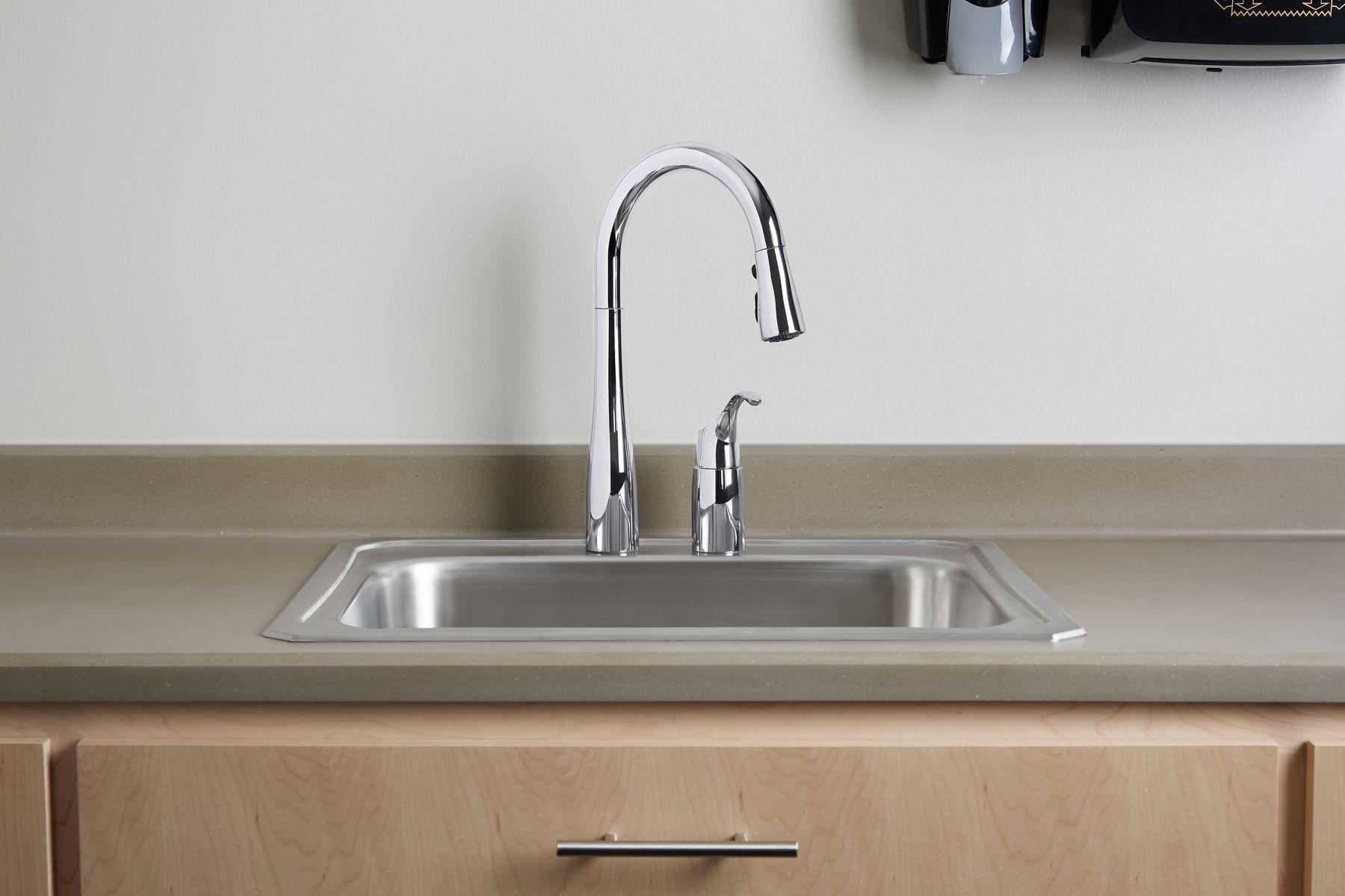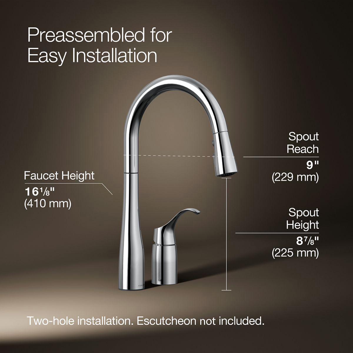 An innovative fit for a variety of kitchens and tasks, this Simplice pull-down kitchen faucet combines an elegant, universal design with exceptional ergonomics and functionality. The high-arch spout rotates 360 degrees and reaches over the tallest pots, while the smoothly maneuvering sprayhead pulls down into the sink for up-close tasks, or out of the sink to fill pots. Sculpted buttons on the sprayhead ensure simple operation even with wet, soapy hands. Sweep spray creates a wide, forceful blade of water for superior cleaning. KOHLER's docking system, DockNetik , secures the pull-down sprayhead to the spout.