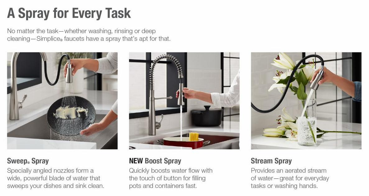 - Three-function pull-down sprayhead with touch-control allows you to switch between stream, Sweep® spray and Boost technology