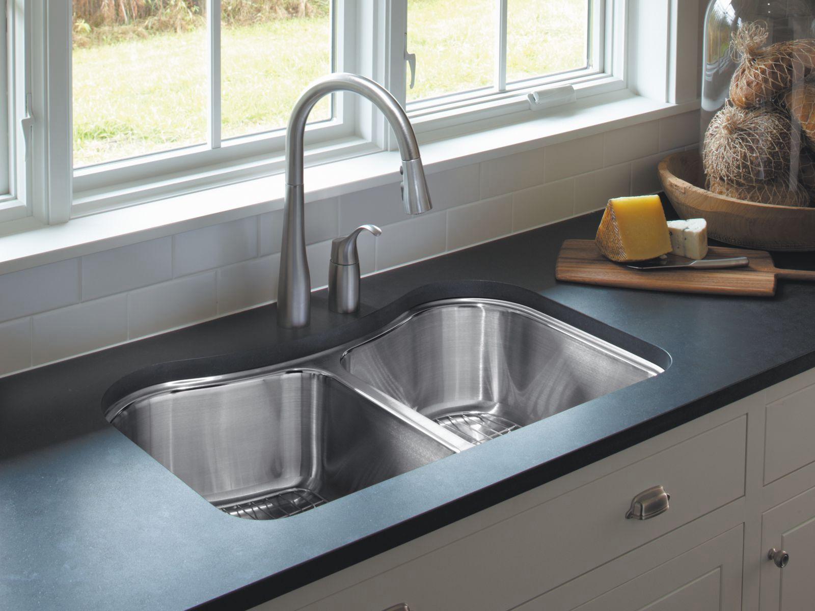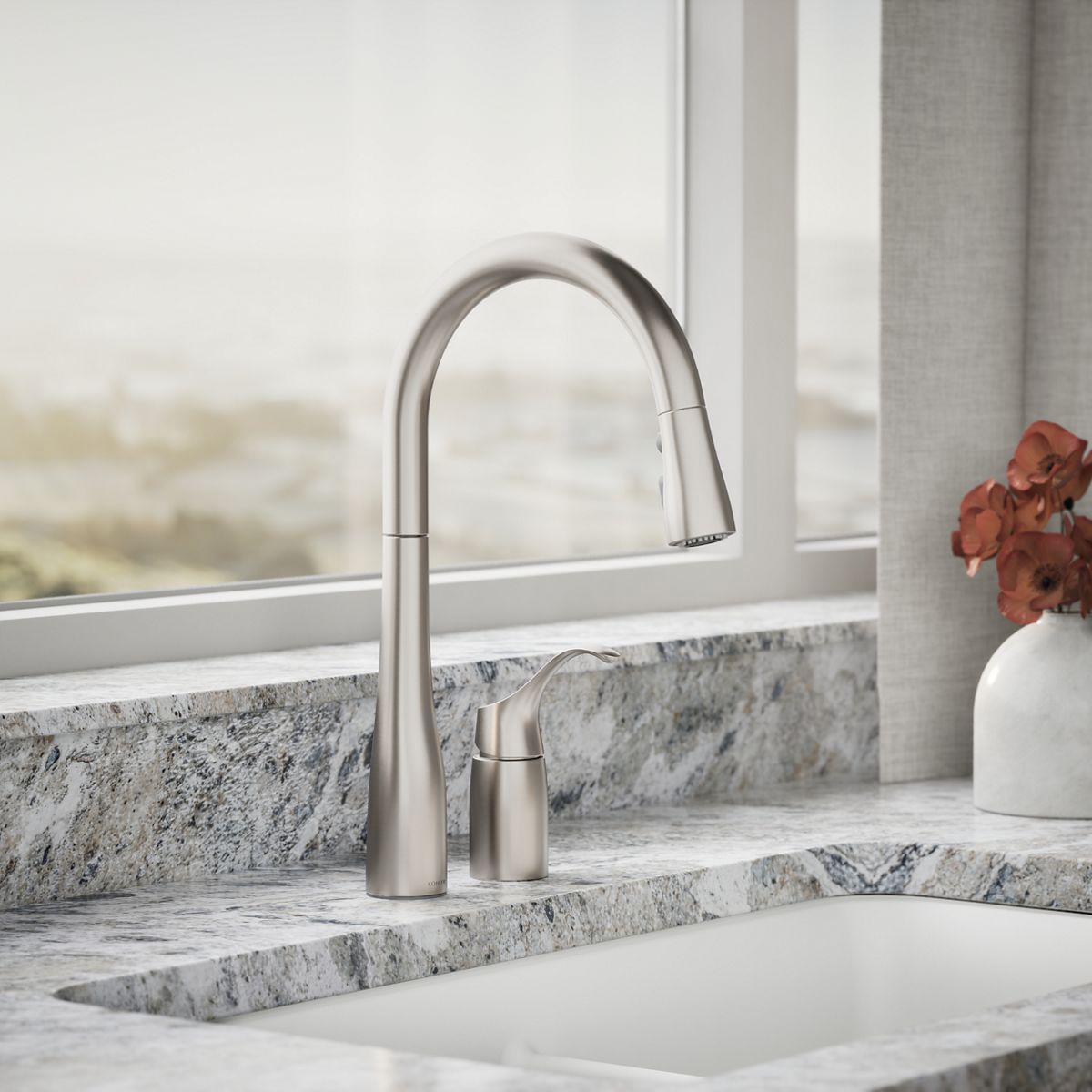 An innovative fit for a variety of kitchens and tasks, this Simplice pull-down kitchen faucet combines an elegant, universal design with exceptional ergonomics and functionality. The high-arch spout rotates 360 degrees and reaches over the tallest pots, while the smoothly maneuvering sprayhead pulls down into the sink for up-close tasks, or out of the sink to fill pots. Sculpted buttons on the sprayhead ensure simple operation even with wet, soapy hands. Sweep spray creates a wide, forceful blade of water for superior cleaning. KOHLER's docking system, DockNetik , secures the pull-down sprayhead to the spout.