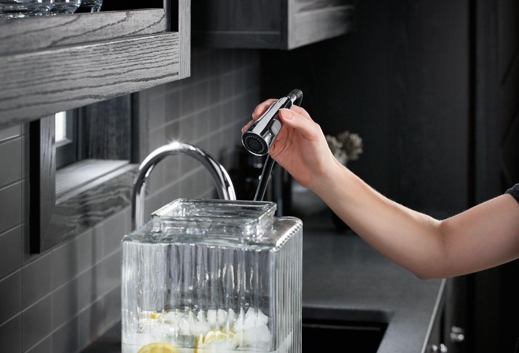 - Three-function pull-down sprayhead with touch-control allows you to switch between stream, Sweep® spray and Boost technology