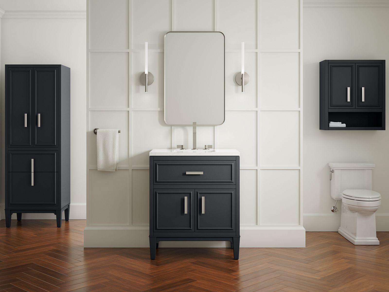 Elegant and mysterious, Southerk bathroom cabinetry evokes contemporary class with a nod to the traditional for an aesthetic that suits any style. Frame-like molding on drawer- and door-front panels tease hidden storage entrances, further adorned with elongated decorative handles that align to form a single design element on stacked drawers. Make your everyday furniture uniquely yours with choice of color. Linen tower, legs, and Vibrant Brushed Nickel hardware are included. Additional hardware finishes are also available.