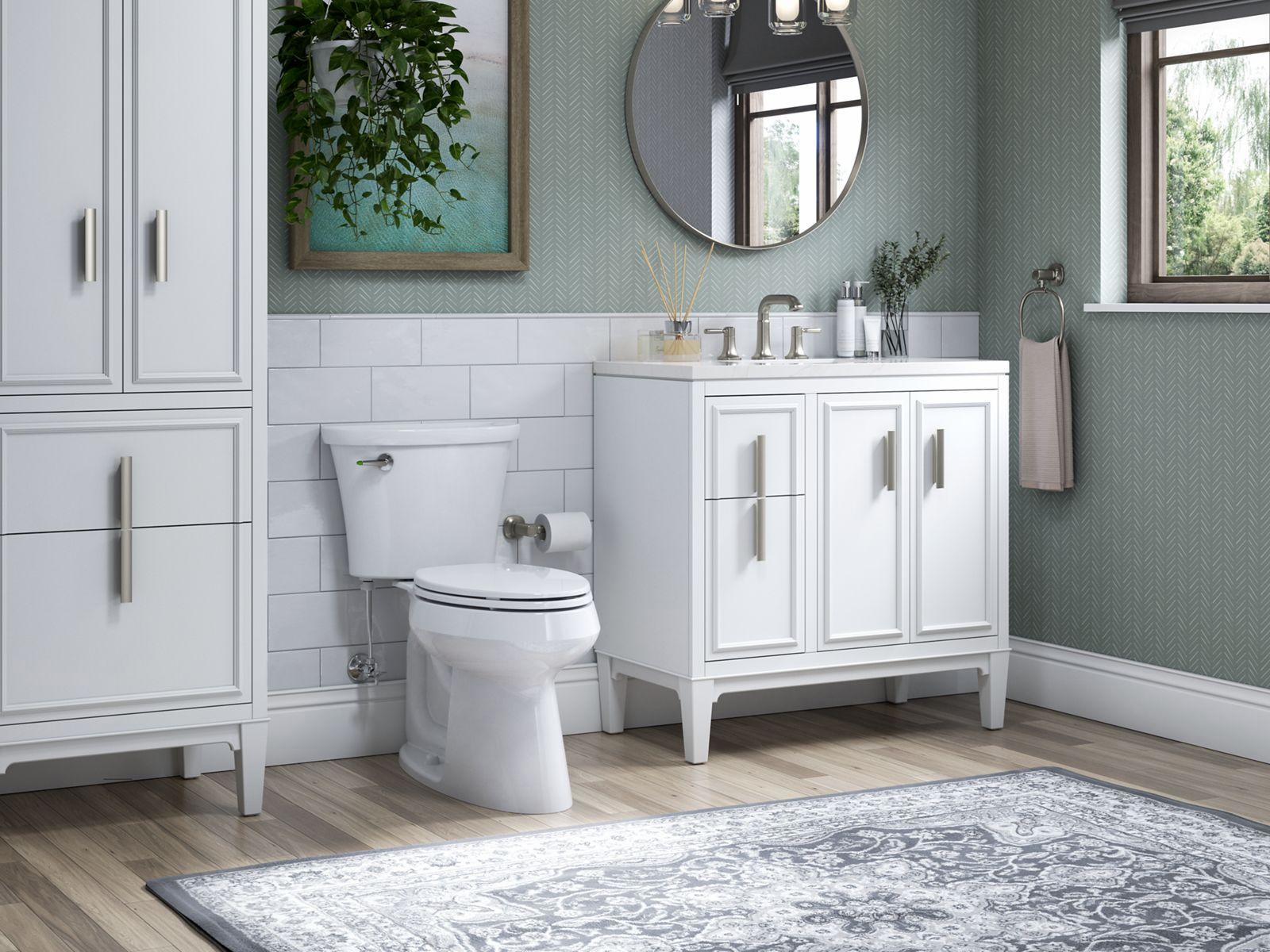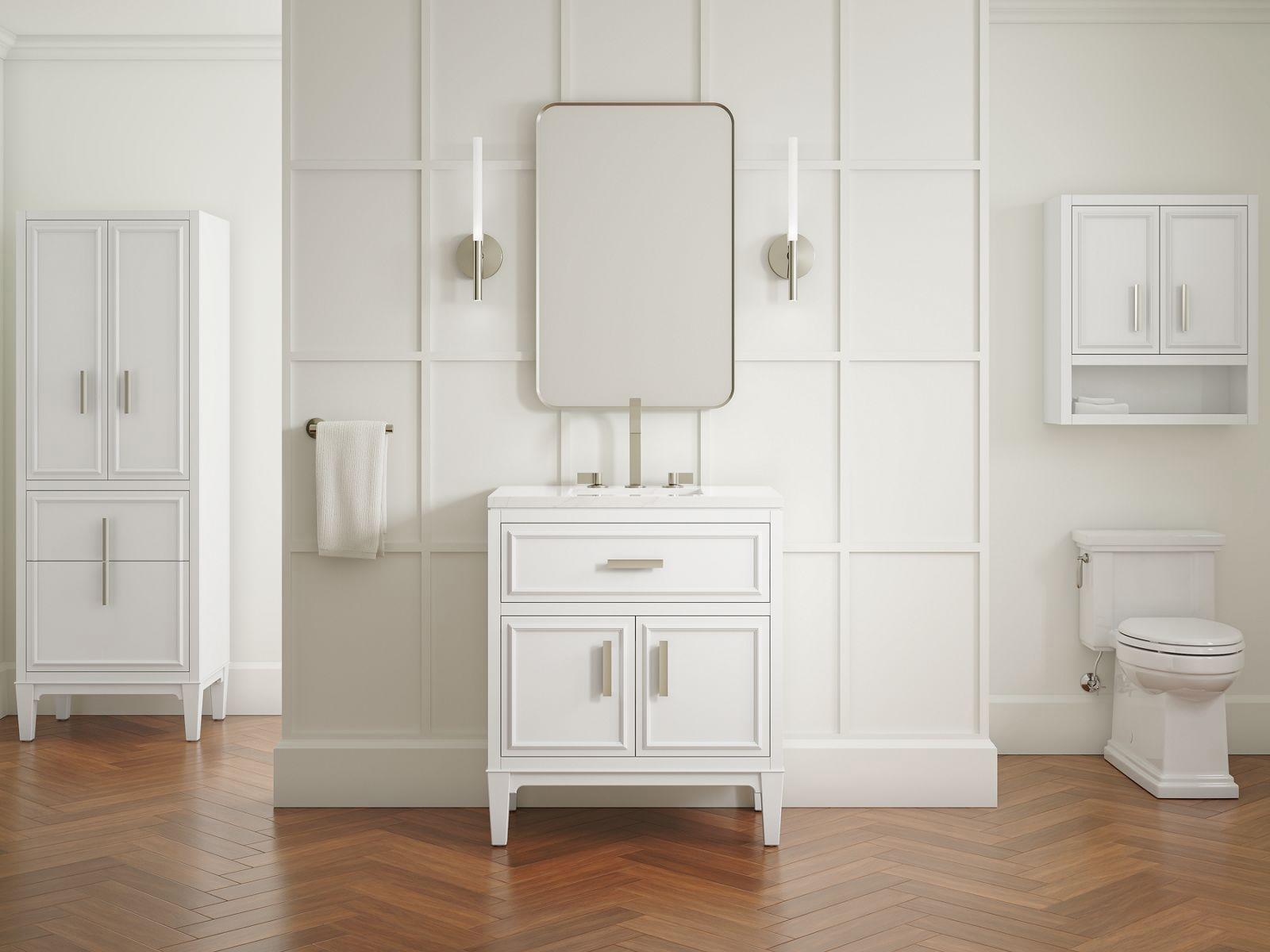 Elegant and mysterious, Southerk bathroom cabinetry evokes contemporary class with a nod to the traditional for an aesthetic that suits any style. Frame-like molding on drawer- and door-front panels tease hidden storage entrances, further adorned with elongated decorative handles that align to form a single design element on stacked drawers. Make your everyday furniture uniquely yours with choice of color. Linen tower, legs, and Vibrant Brushed Nickel hardware are included. Additional hardware finishes are also available.