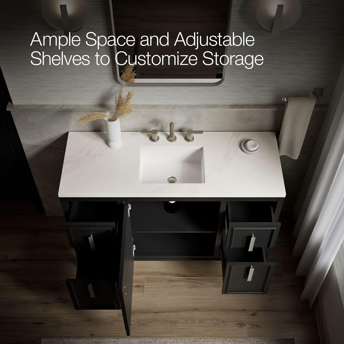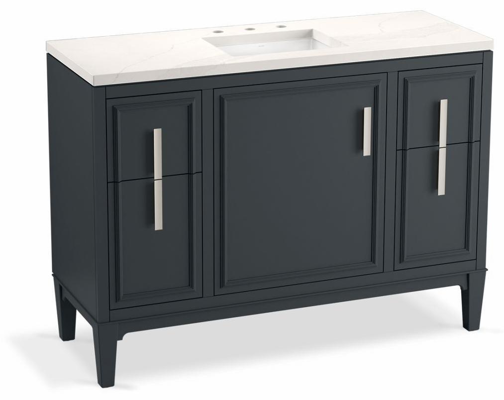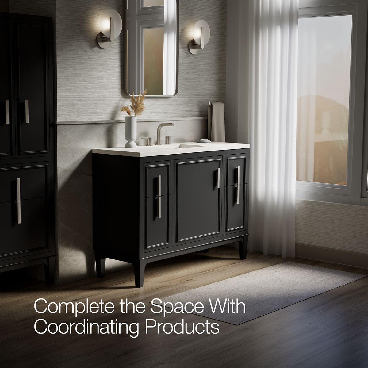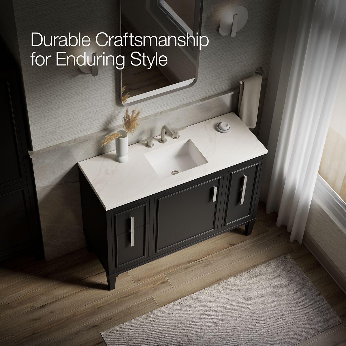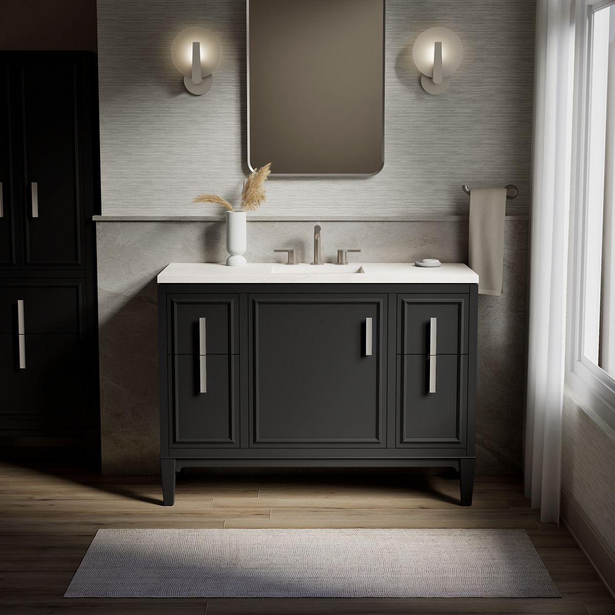 Elegant and mysterious, Southerk bathroom vanities evoke contemporary class with a nod to the traditional for an aesthetic that suits any style. Frame-like molding on drawer- and door-front panels tease hidden storage entrances, further adorned with elongated decorative handles that align to form a single design element on stacked drawers. Make your everyday vanity uniquely yours with choice of color. Cabinet, countertop, sink, legs, and Vibrant Brushed Nickel hardware are included with the vanity set, which is ready to self-install during your next bathroom update. Additional hardware finishes are also available.