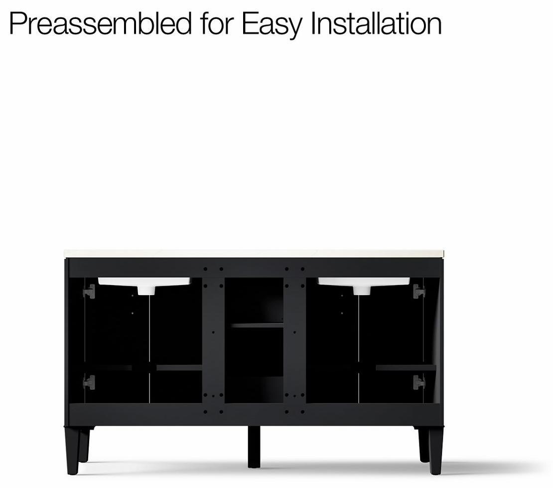- Set includes cabinet, precut quartz vanity top, sinks, legs, and cabinet hardware.
