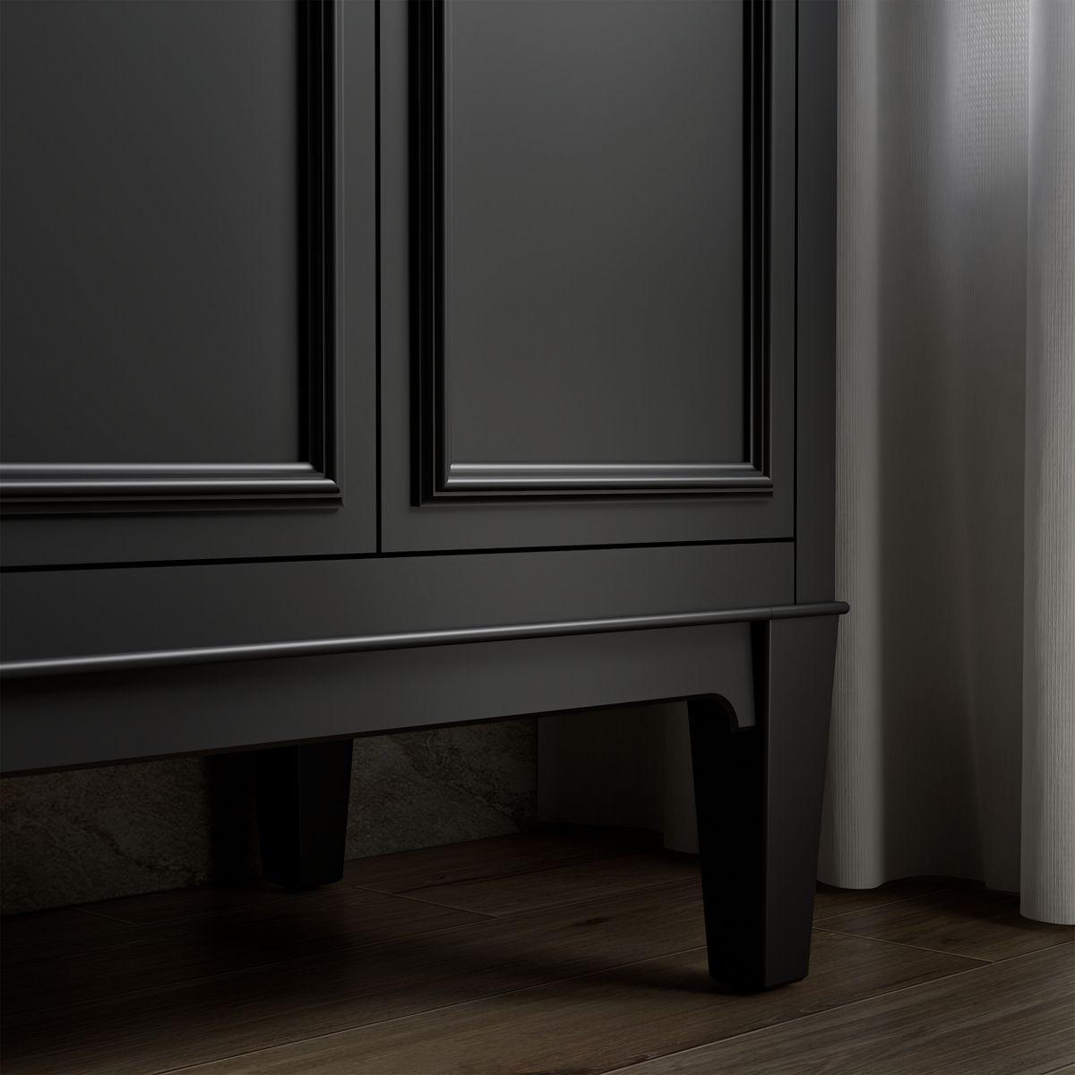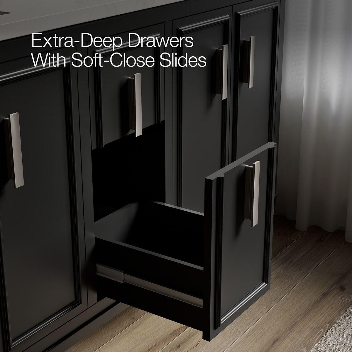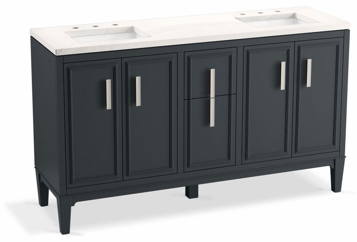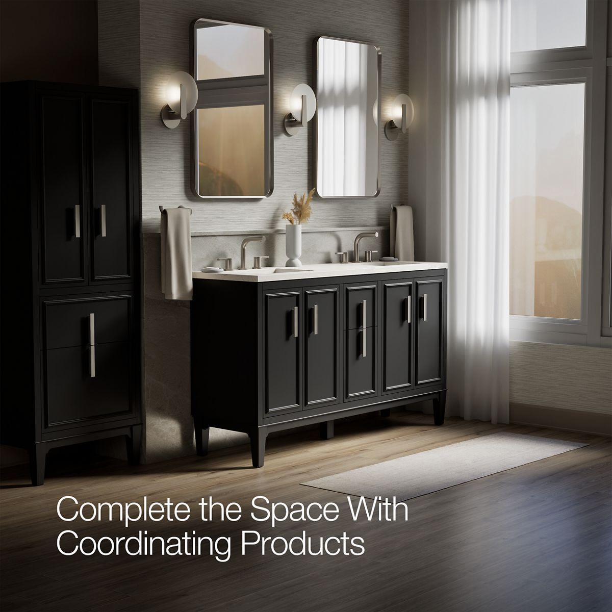Elegant and mysterious, Southerk bathroom vanities evoke contemporary class with a nod to the traditional for an aesthetic that suits any style. Frame-like molding on drawer- and door-front panels tease hidden storage entrances, further adorned with elongated decorative handles that align to form a single design element on stacked drawers. Make your everyday vanity uniquely yours with choice of color. Cabinet, countertop, sinks, legs, and Vibrant Brushed Nickel hardware are included with the vanity set, which is ready to self-install during your next bathroom update. Additional hardware finishes are also available.