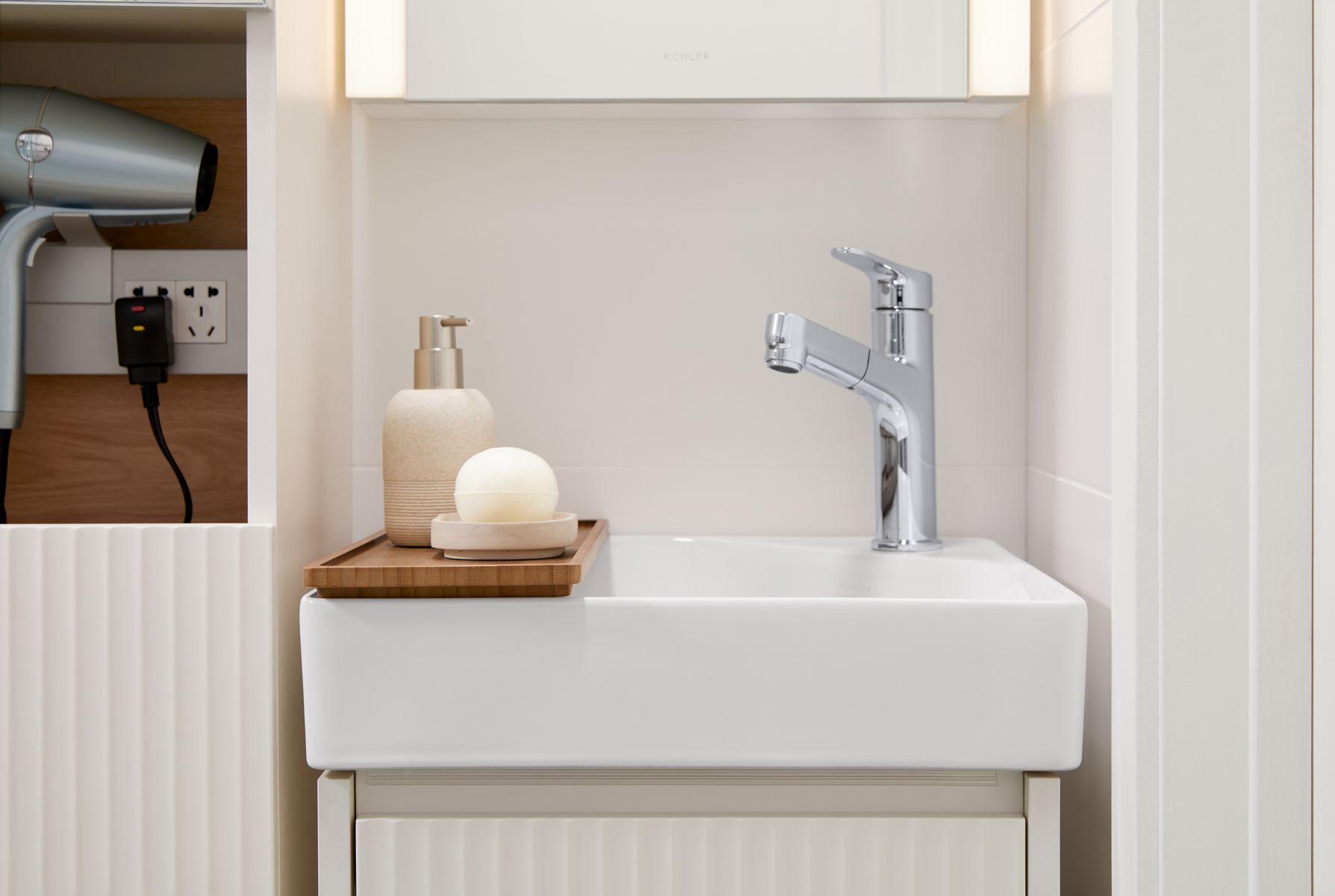 The Spacity 30 vanity top with integrated sink is designed to maximize small-space living. Featuring a corner faucet deck and storage deck for placing small items, this sink also showcases thin angled edges designed for hanging containers that store toiletries. Position the vanity top with integrated sink atop the coordinating Spacity 28-3/4 bathroom vanity cabinet for an overhanging vanity setup.
