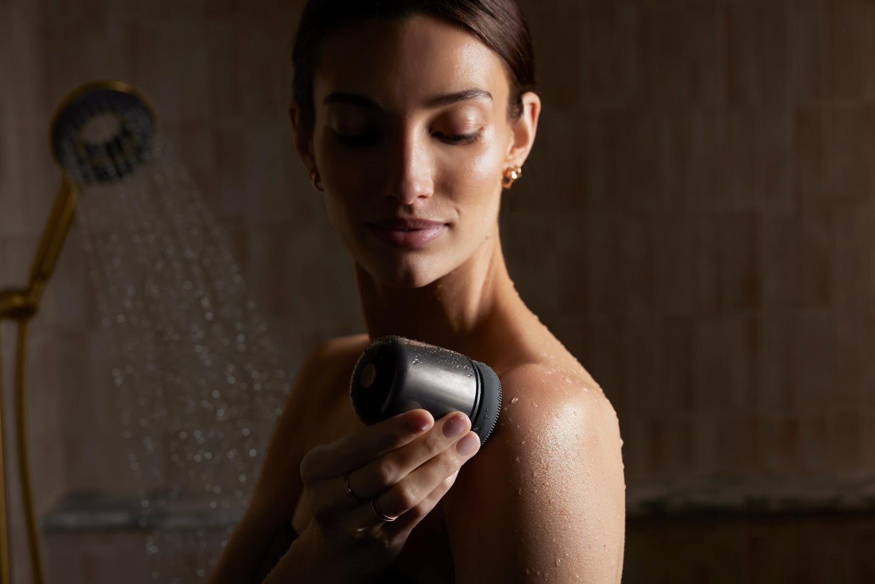 - All-in-one cleansing device features four interchangeable attachments: facial brush, body brush, body scrubber, and body massager