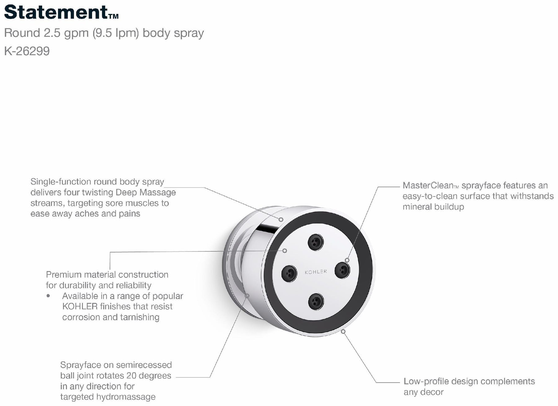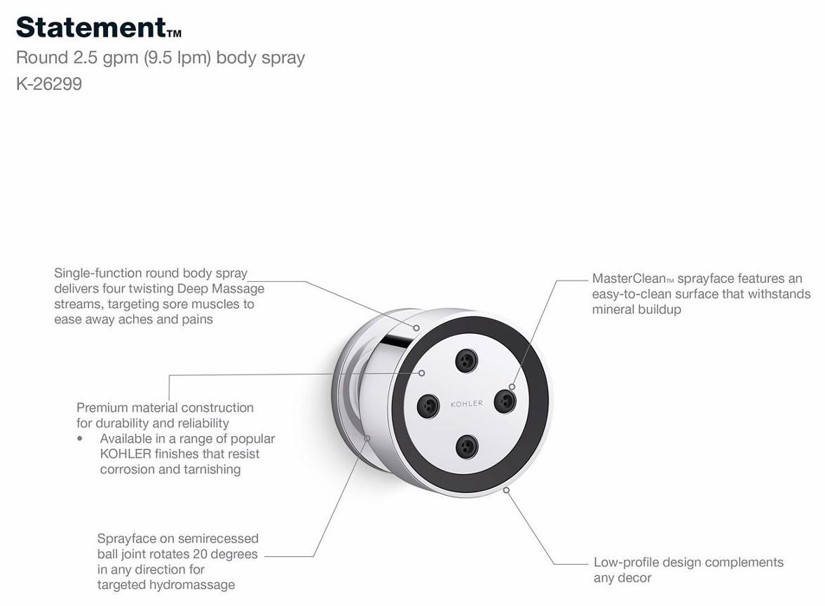 Relax and relieve sore muscles with spa-like hydrotherapy in your upgraded custom shower space. This surface-mount single-function body spray features four high-pressure Deep Massage streams within a rotating ball joint, ideal for achy muscles. Semi-recessed into the shower wall, the body spray rotates 20-degree in any direction. Install multiples for the ultimate therapeutic shower experience.