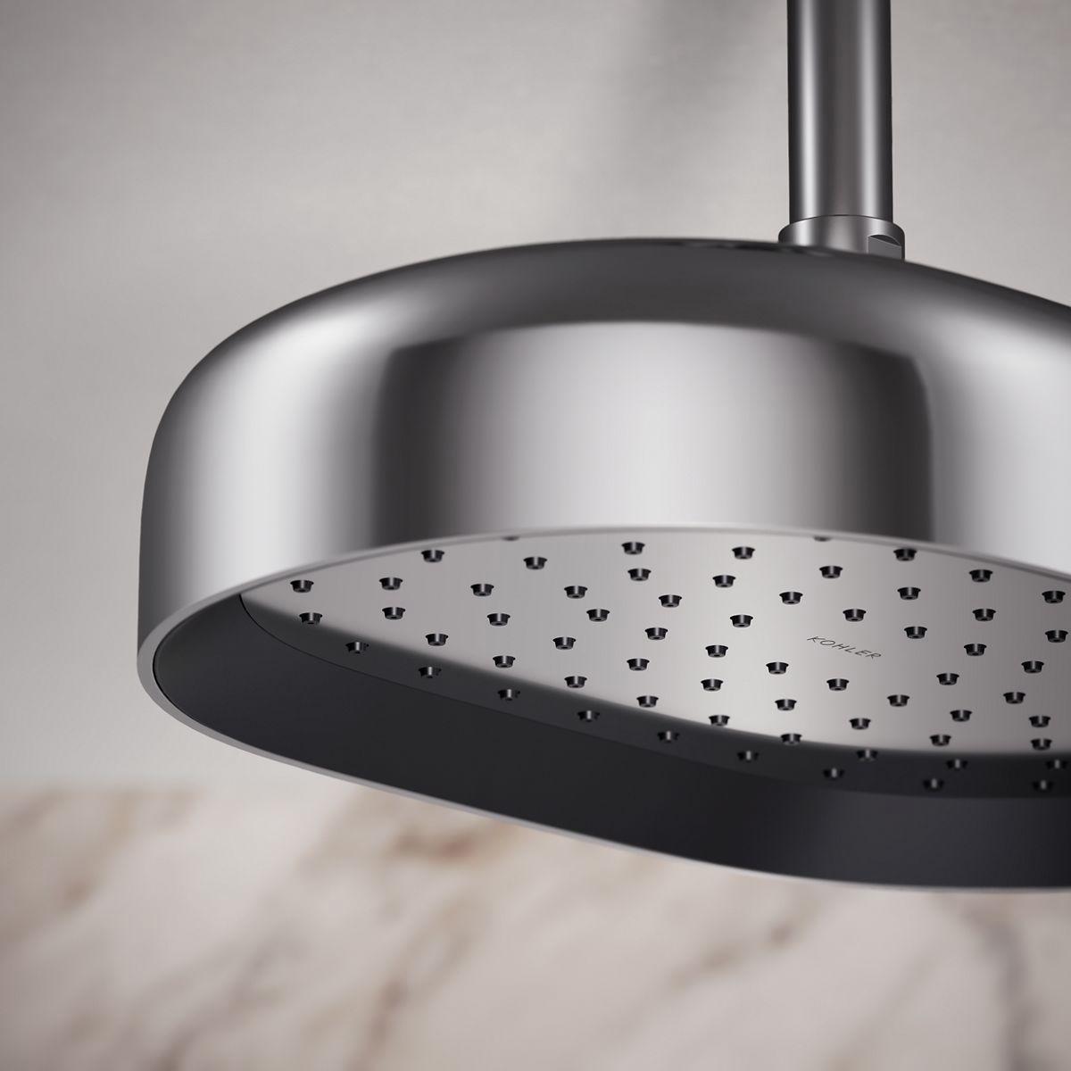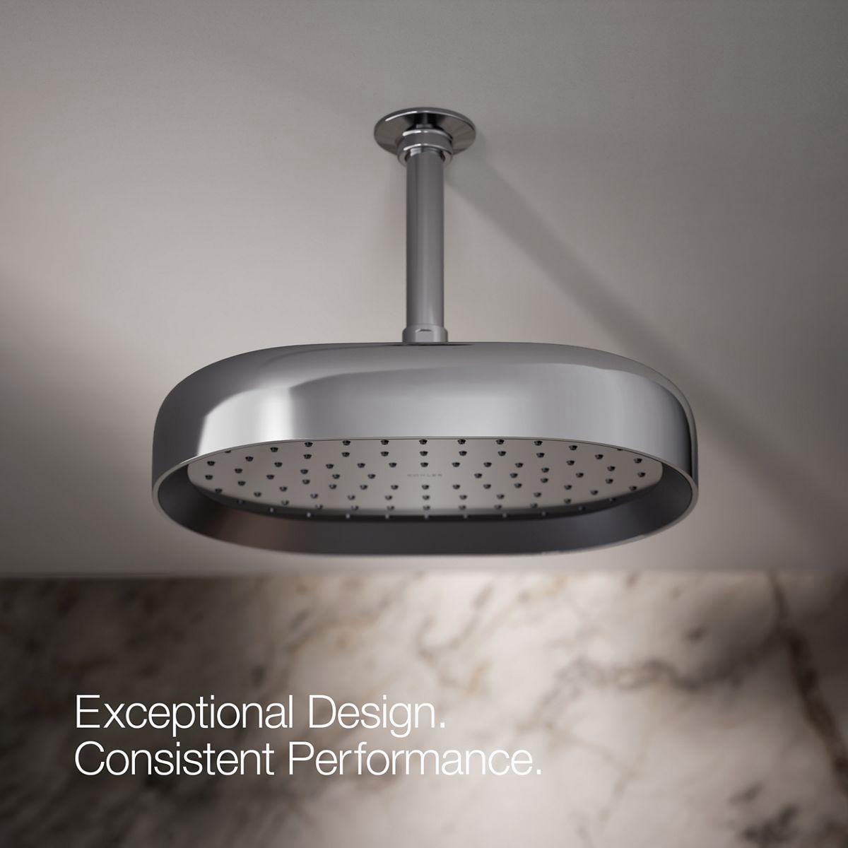 Enjoy a shower that simulates a soaking summer storm, all while conserving water. This contemporary 12 oblong rainhead features Full Coverage with Katalyst air-induction technology, which efficiently mixes air and water to produce large water droplets and deliver a powerful, consistent, full overhead spray experience at 1.75 gpm. The single-function rainhead's clean good looks and durable finish coordinate with many KOHLER faucets and accessories.
