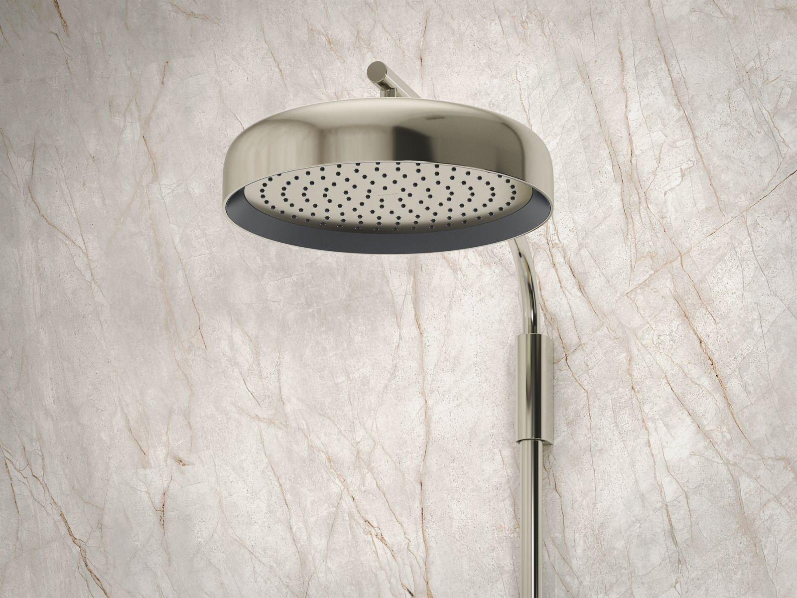 Enjoy a shower that simulates a soaking summer storm, all while conserving water. This contemporary 12 round rainhead features Full Coverage with Katalyst air-induction technology, which efficiently mixes air and water to produce large water droplets and deliver a powerful, consistent, full overhead spray experience at 1.75 gpm. The single-function rainhead's clean good looks and durable finish coordinate with many KOHLER faucets and accessories.