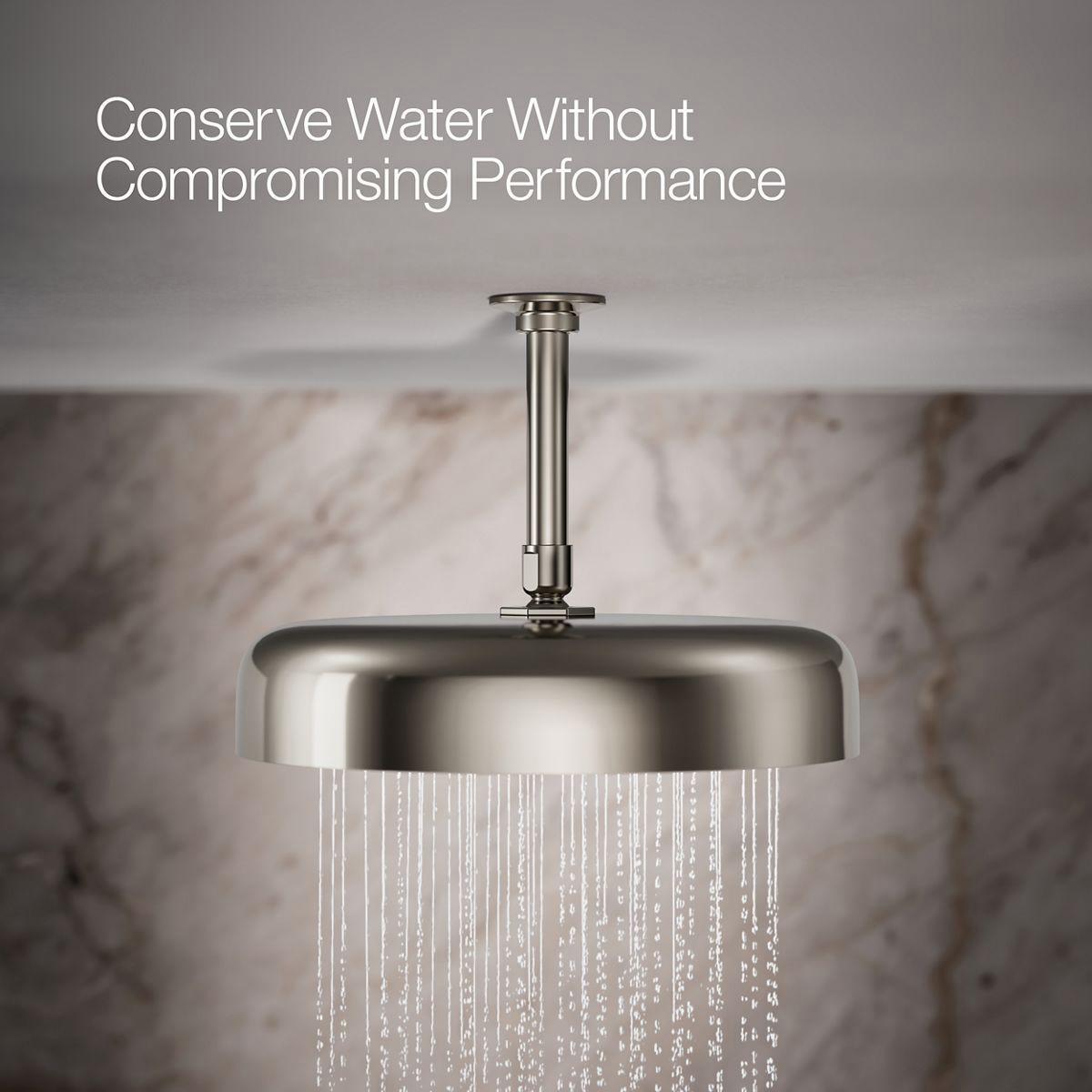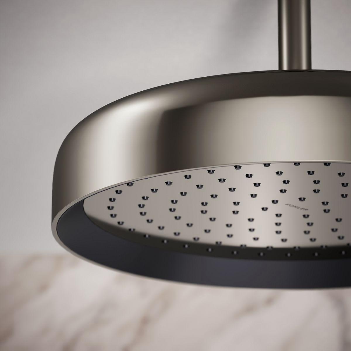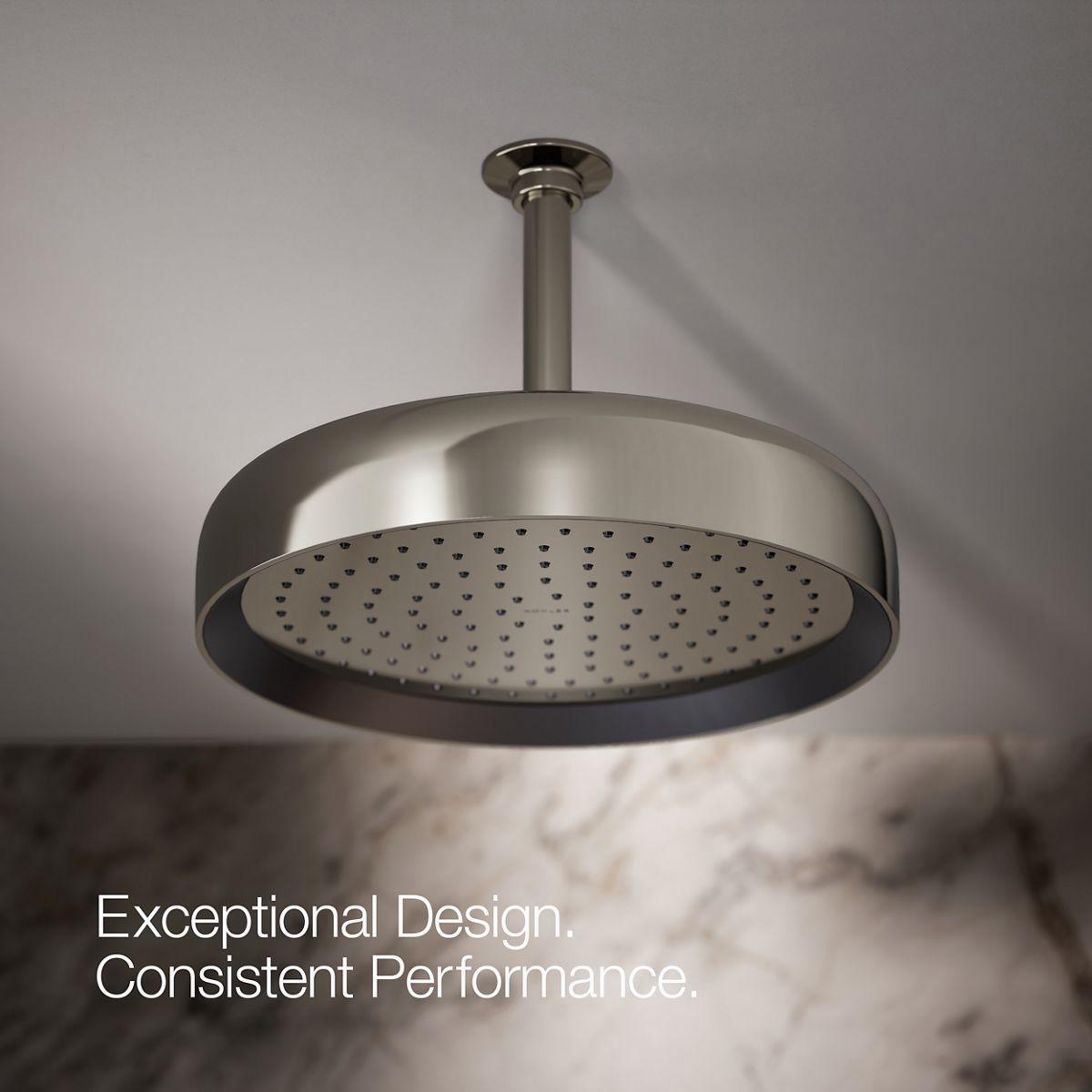 Enjoy a shower that simulates a soaking summer storm, all without wasteful overspray. This contemporary 12 round rainhead features Full Coverage with Katalyst air-induction technology, which efficiently mixes air and water to produce large water droplets and deliver a powerful, consistent, full overhead spray experience. The single-function rainhead's clean good looks and durable finish coordinate with many KOHLER faucets and accessories.