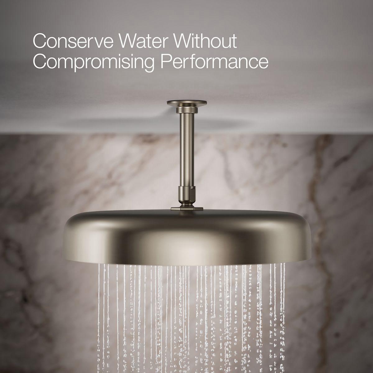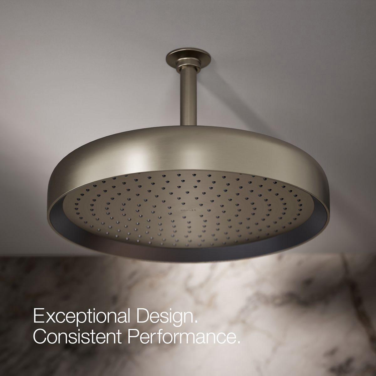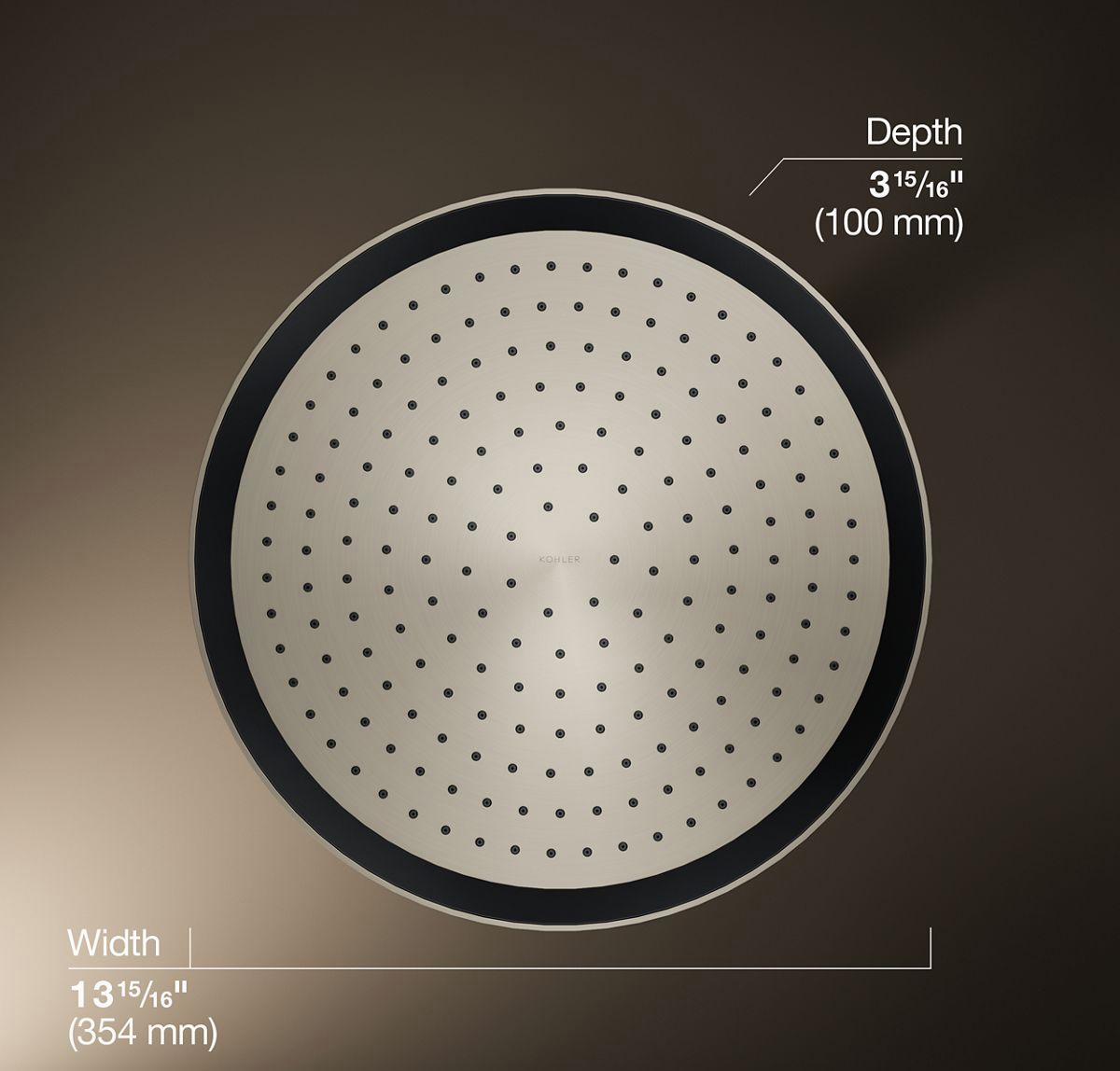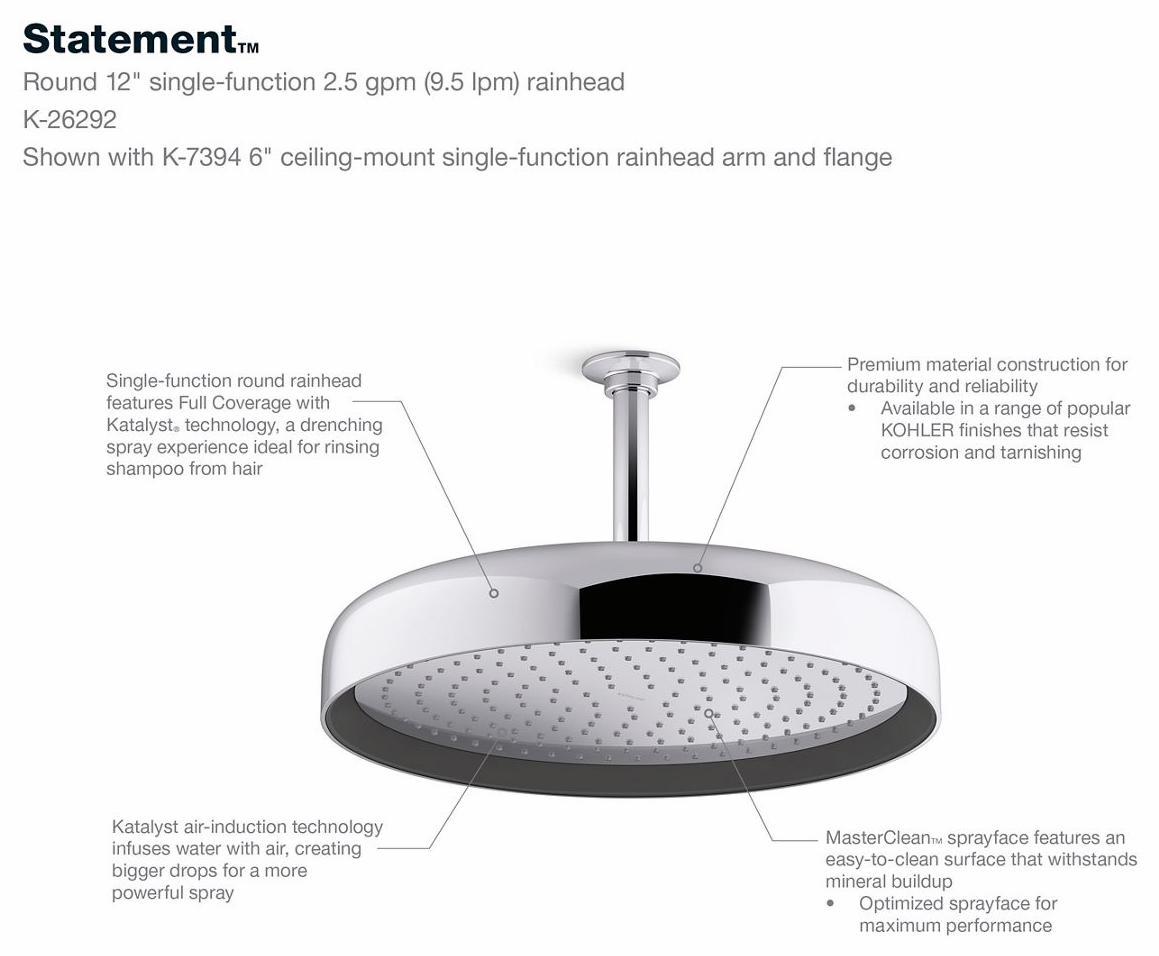 Enjoy a shower that simulates a soaking summer storm, all without wasteful overspray. This contemporary 14 round rainhead features Full Coverage with Katalyst air-induction technology, which efficiently mixes air and water to produce large water droplets and deliver a powerful, consistent, full overhead spray experience. The single-function rainhead's clean good looks and durable finish coordinate with many KOHLER faucets and accessories.