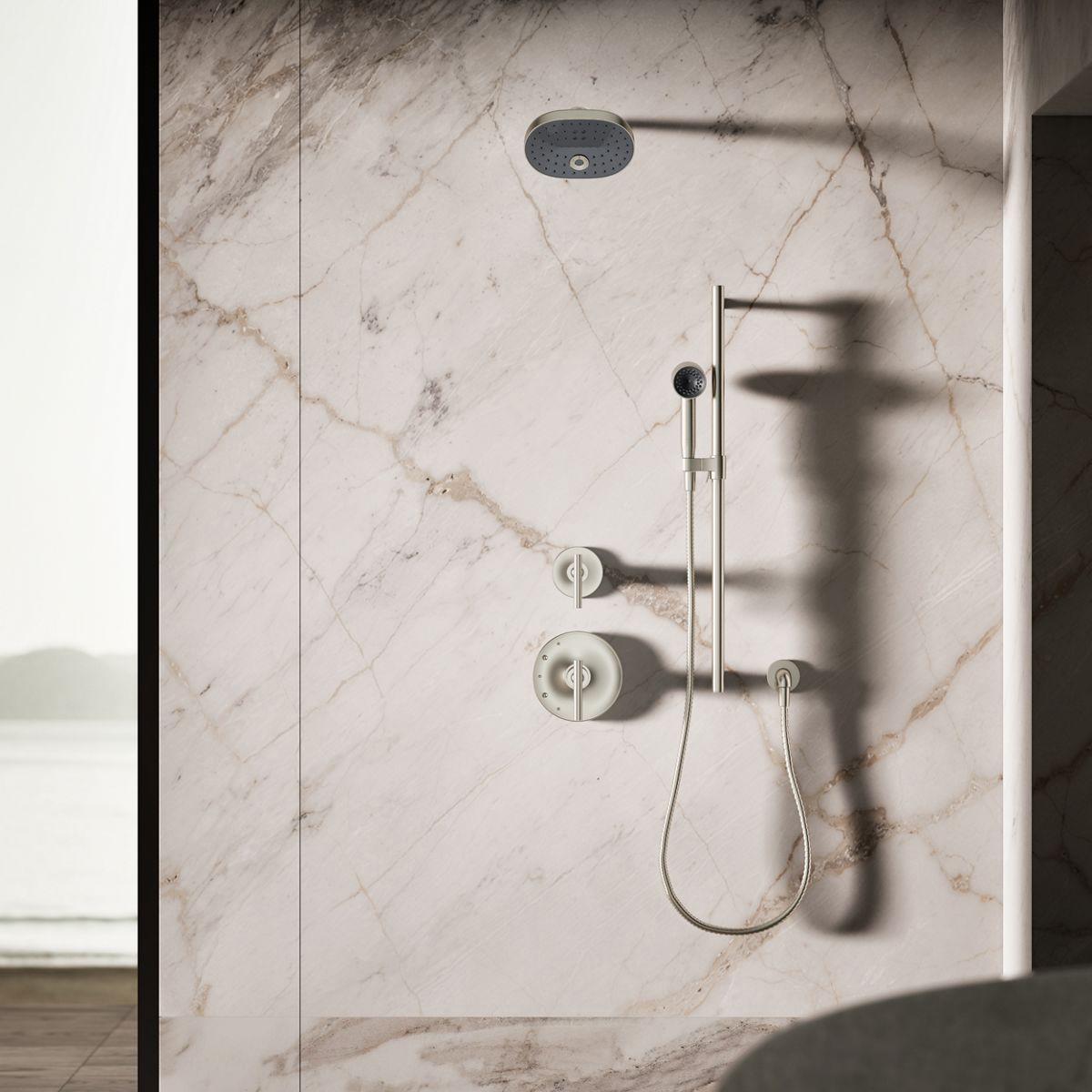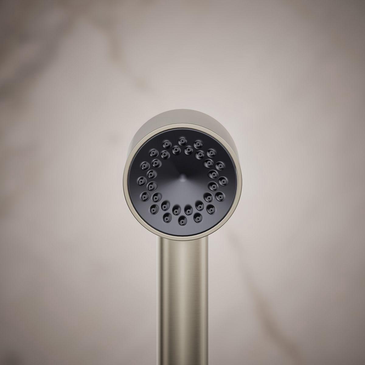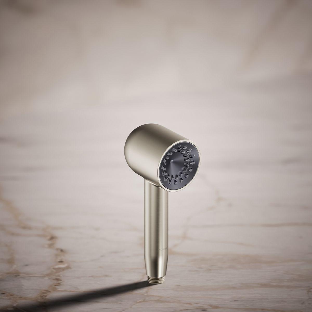 Power your shower with the flexibility of the Statement iconic 1.75 gpm handshower, featuring the unique Infinity spray that provides three spray experiences in one--all while conserving water. The hourglass-shaped spray starts with a powerful rinse in the upper zone, converging into a massaging middle stream, then diverging into broad, everyday warmth and coverage in the lower zone. The compact barrel-shaped handshower features a sleek, minimalist design and durable finishes that coordinates with many KOHLER faucets and accessories.