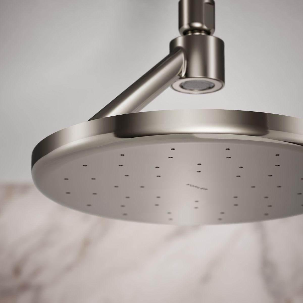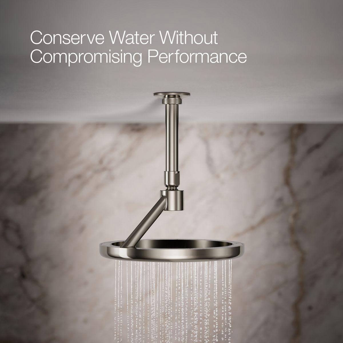 Let the drenching Full Coverage Rain spray experience of Statement Open Rain wash stress and tension away. This innovative 9 round rainhead features an exposed top stream that momentarily pools into a wide-nozzle face plate and quickly releases as a deluge of water. A self-leveling ball joint keeps the rainhead parallel to the floor, providing a steady spray for consistent coverage. With a unique contemporary design and durable finish, this rainhead brings standout style and function to your showering space.