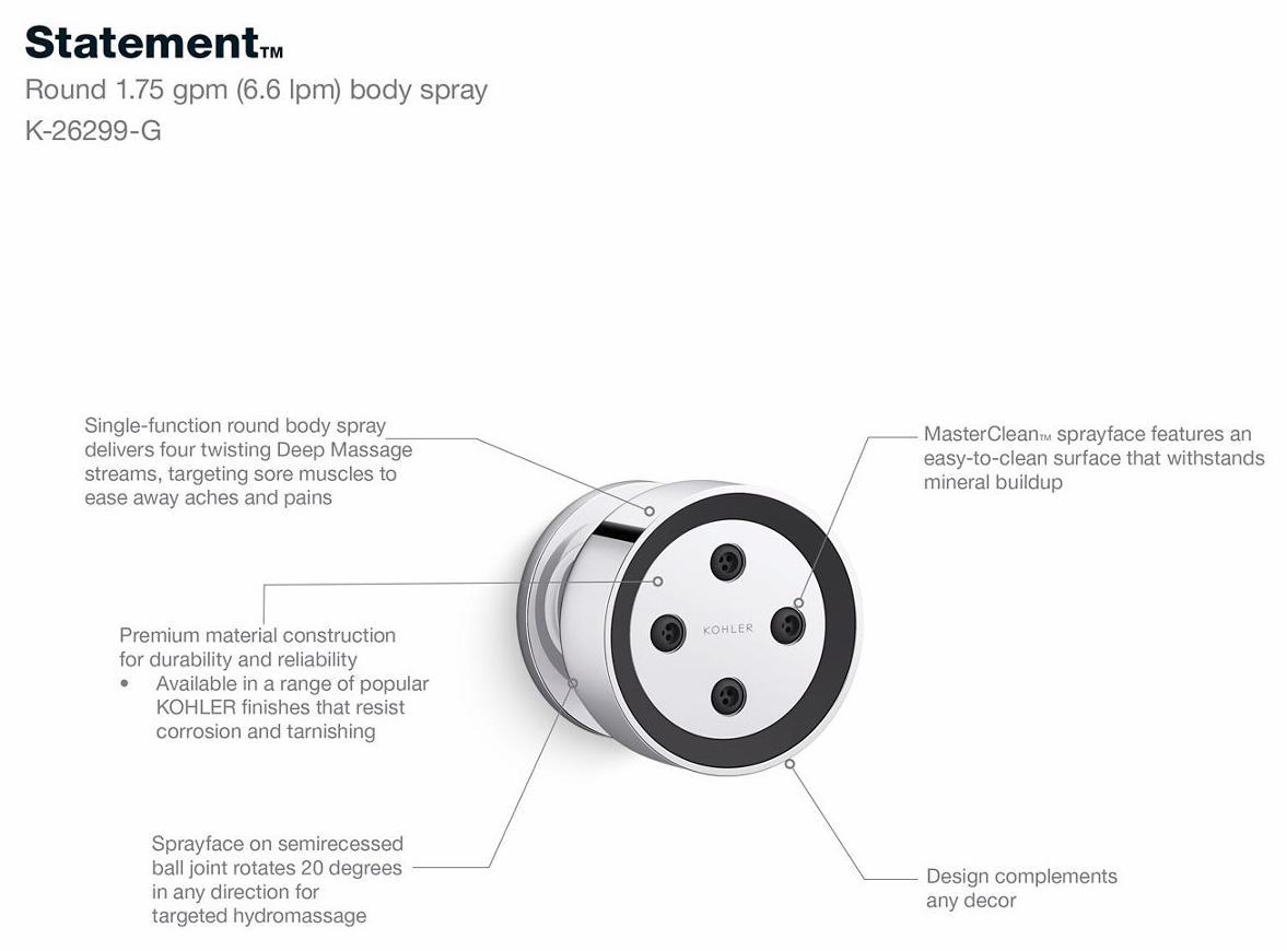 Relax and relieve sore muscles with spa-like hydrotherapy in your upgraded custom shower space. This surface-mount single-function body spray with water-conserving 1.75 gpm flow rate features four high-pressure Deep Massage streams within a rotating ball joint, ideal for achy muscles. Semi-recessed into the shower wall, the body spray rotates 20° in any direction. Install multiples for the ultimate therapeutic shower experience.