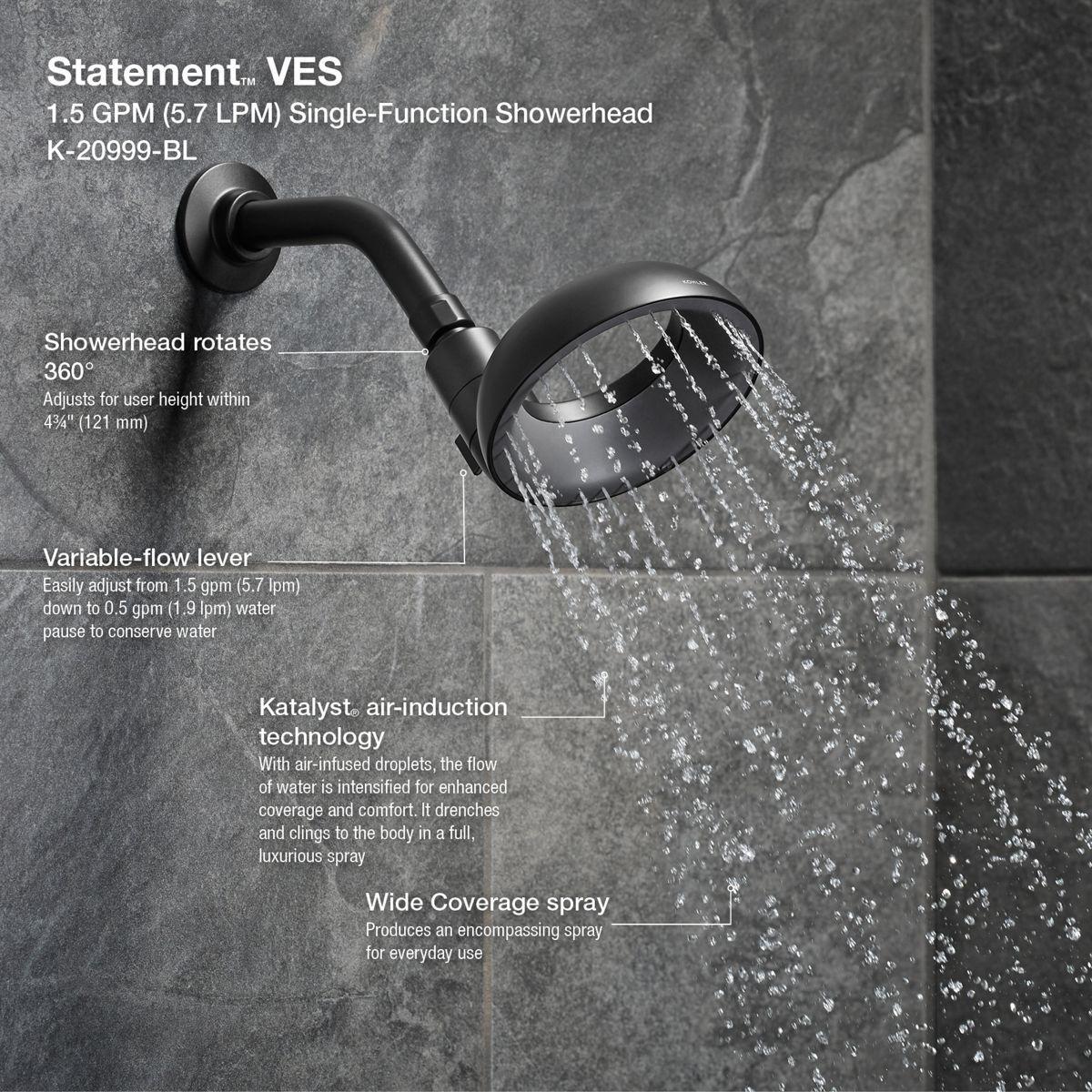 Create a luxurious showering experience with this Statement VES variable-flow showerhead with Katalyst technology. Single-function showerhead delivers perfectly balanced full-coverage spray, while adjustable flow lever allows you to conserve water, if desired. Showerhead is height adjustable and rotates 360°, with an artfully sculpted sprayface that complements contemporary and minimalist baths.