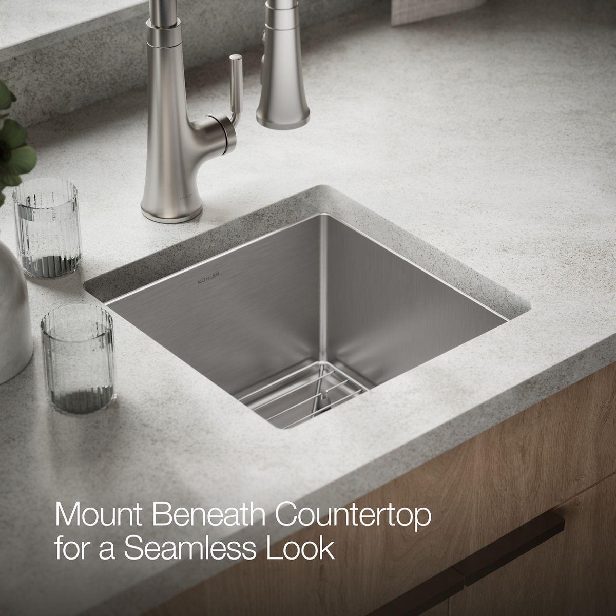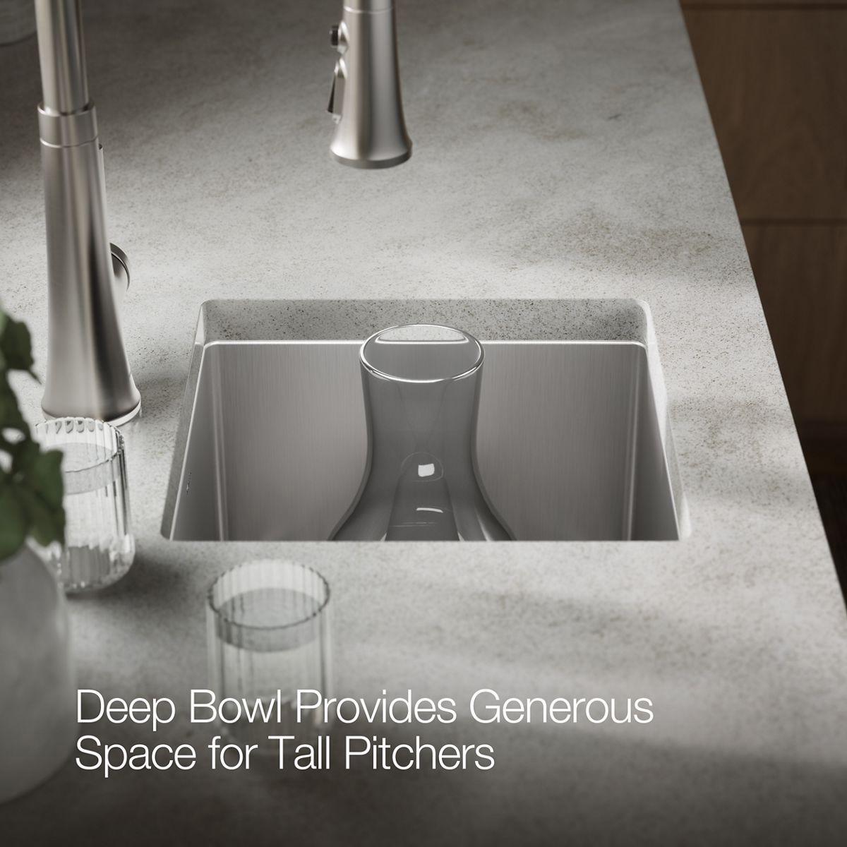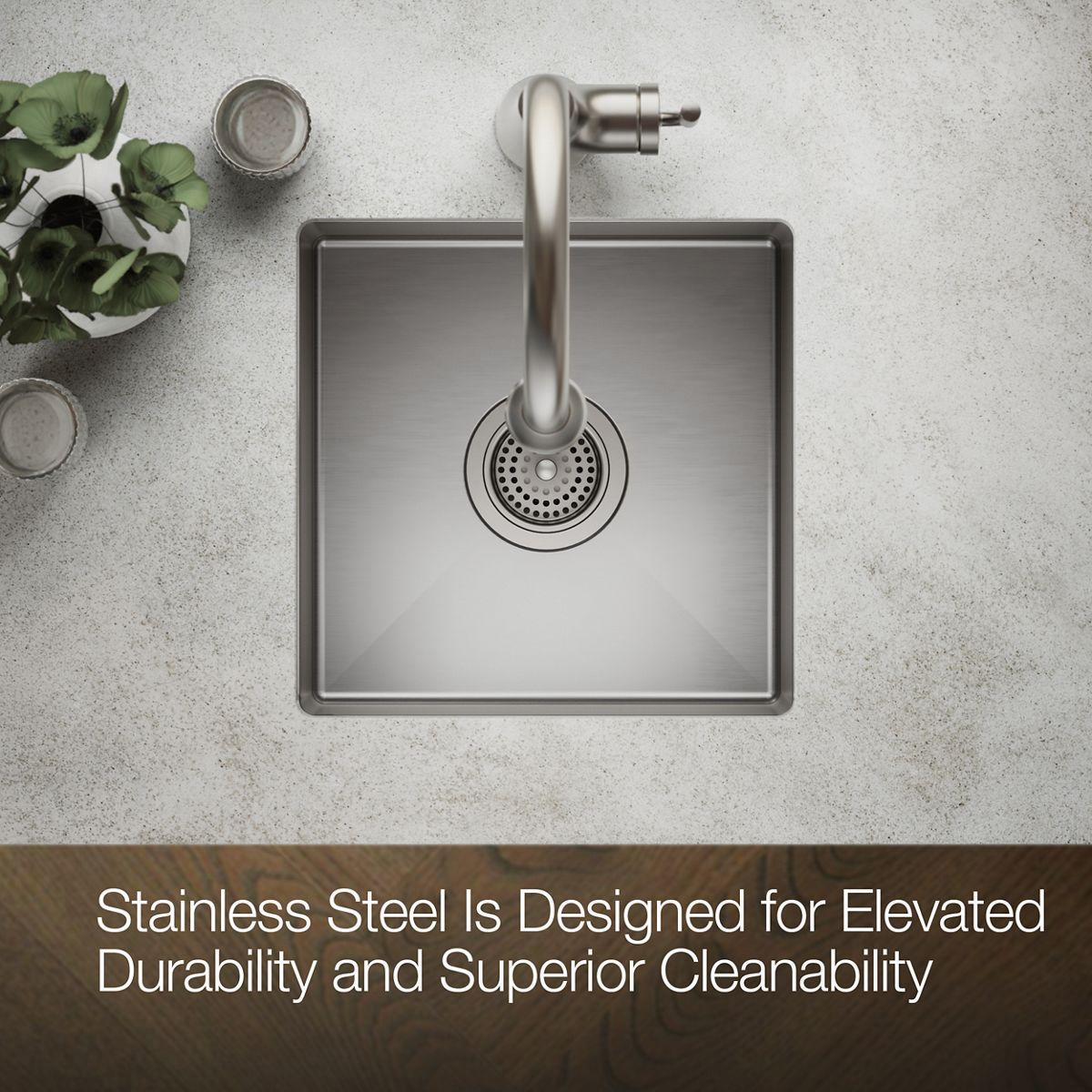 This Strive bar sink offers professional style with easy-to-clean curved corners. Made of thick, premium quality 16-gauge stainless steel, the compact basin features a sound-absorption system that significantly reduces disposal and dishwashing noise. This entertainment sink includes a bottom sink rack to help prevent scratches.