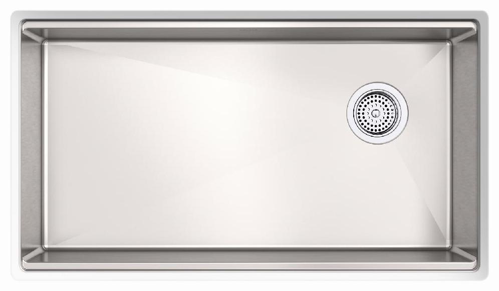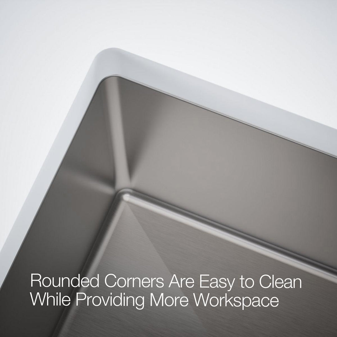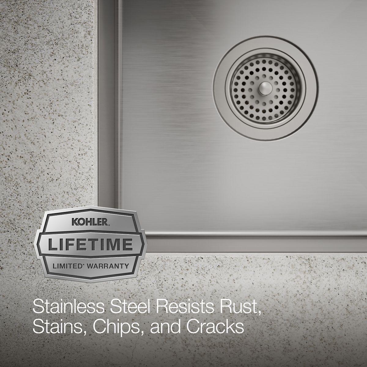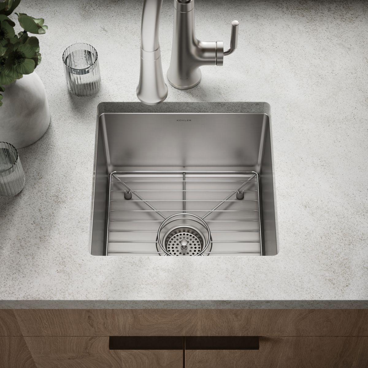 This Strive bar sink offers professional style with easy-to-clean curved corners. Made of thick, premium quality 16-gauge stainless steel, the compact basin features a sound-absorption system that significantly reduces disposal and dishwashing noise. This entertainment sink includes a bottom sink rack to help prevent scratches.