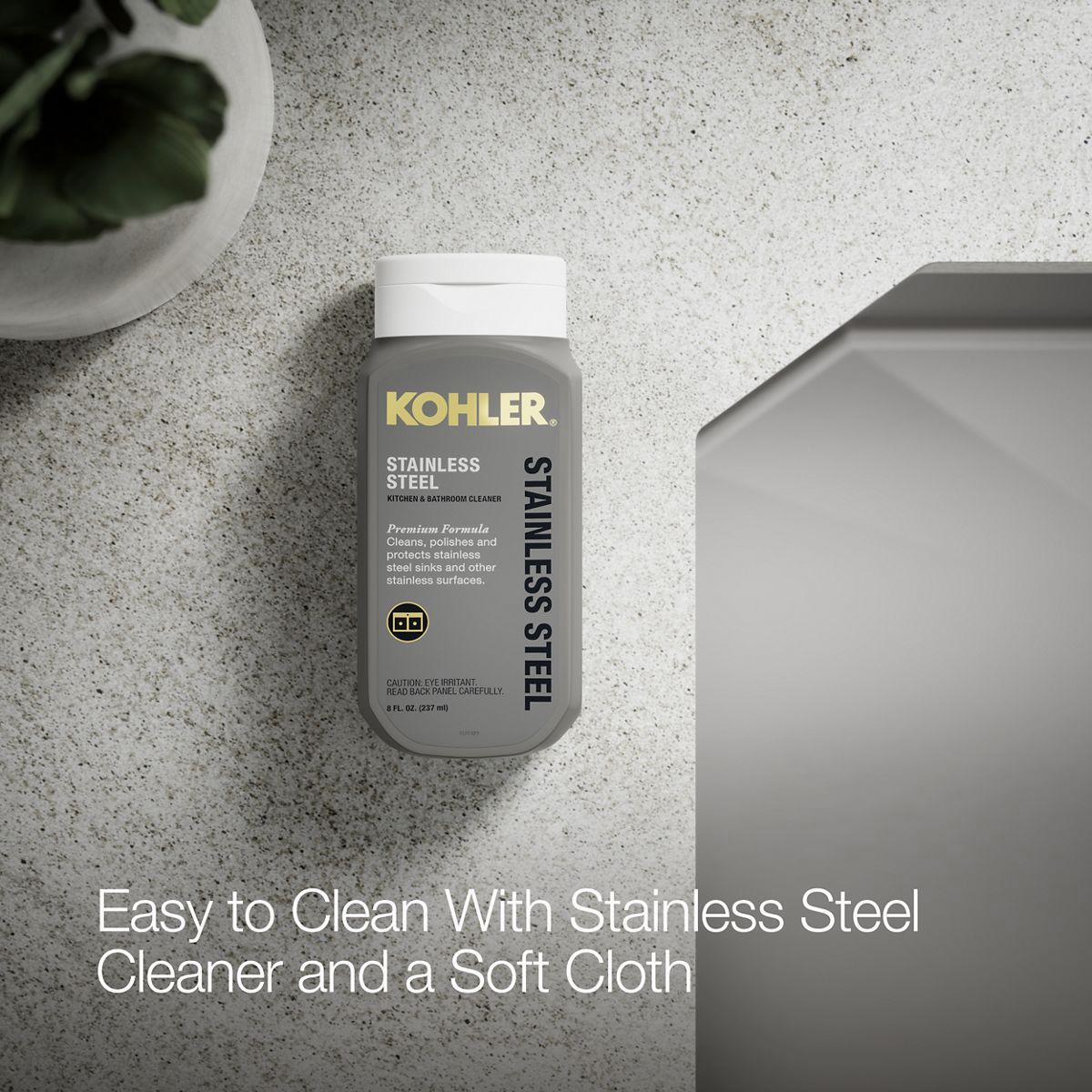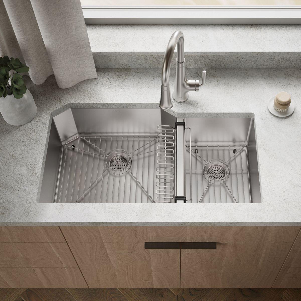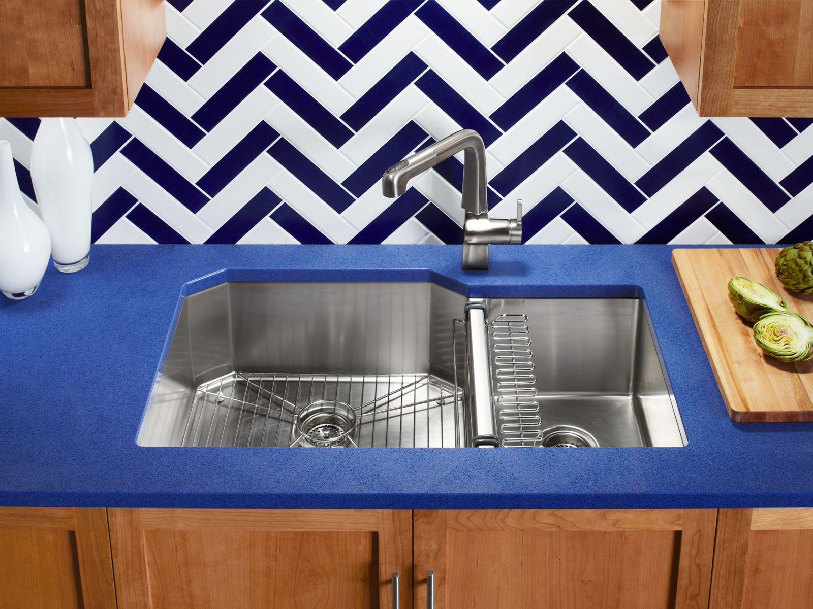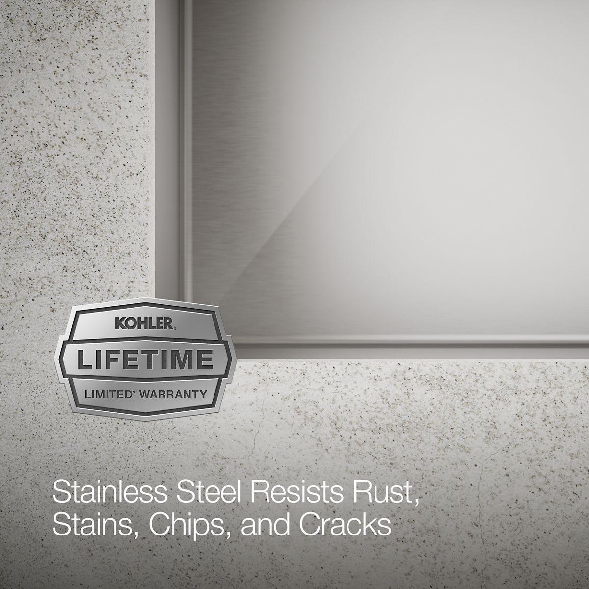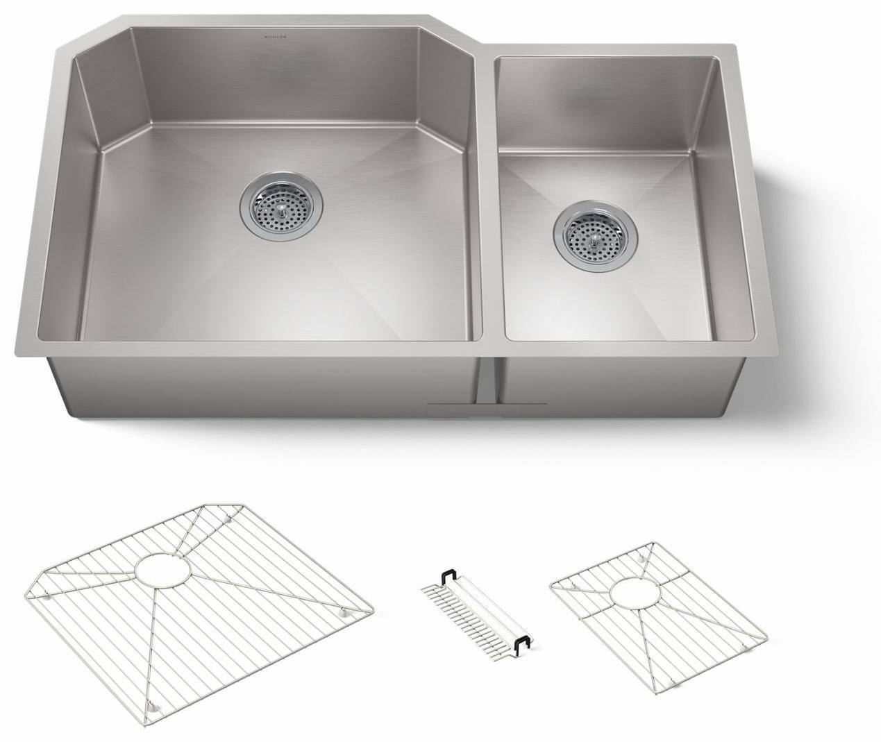 This Strive kitchen sink offers professional style with easy-to-clean curved corners. Made of thick, premium quality 16-gauge stainless steel, the unique extra-large offset bowls maximize cabinet space, making room for your largest bakeware and cookware. Strive features a sound-absorption system that significantly reduces disposal and dishwashing noise. This sink includes a divider dishcloth bar, a divider utility shelf for scrubbers and sponges, and a bottom sink rack to help prevent scratches.