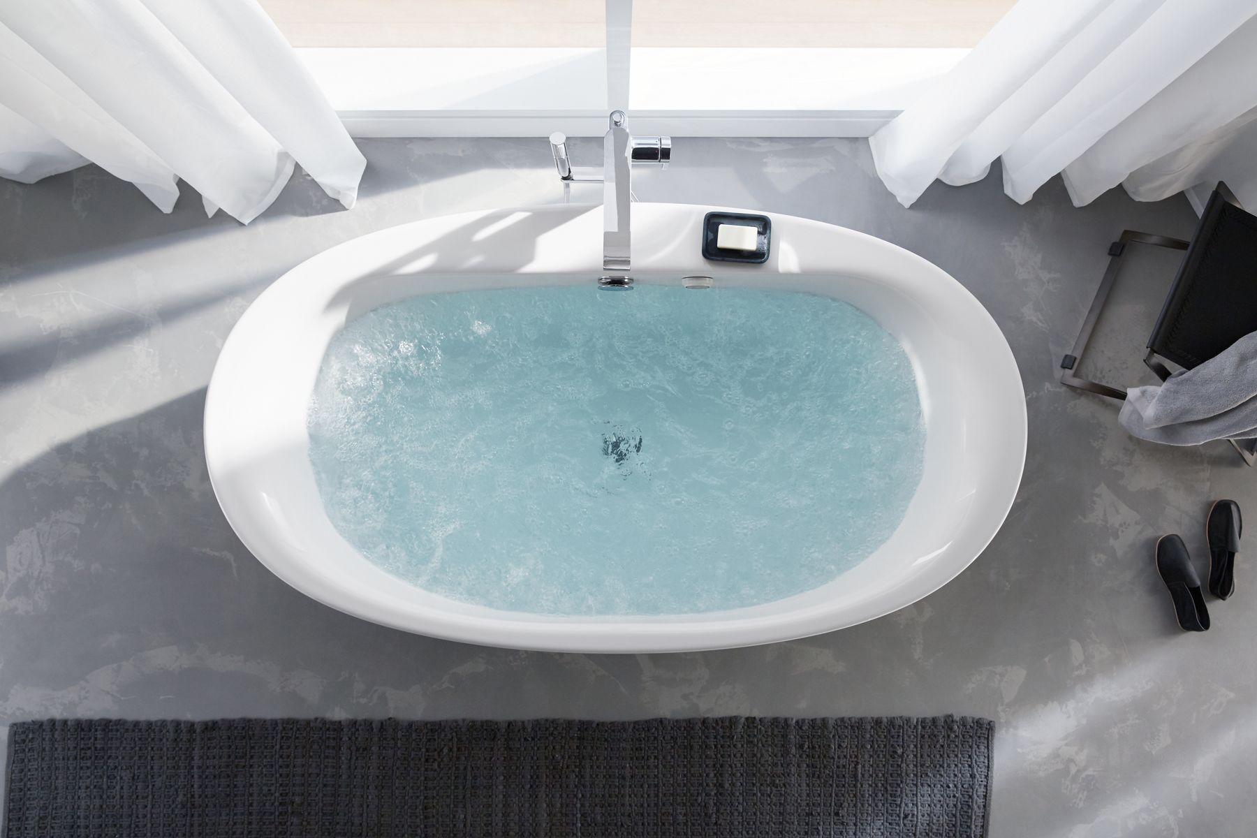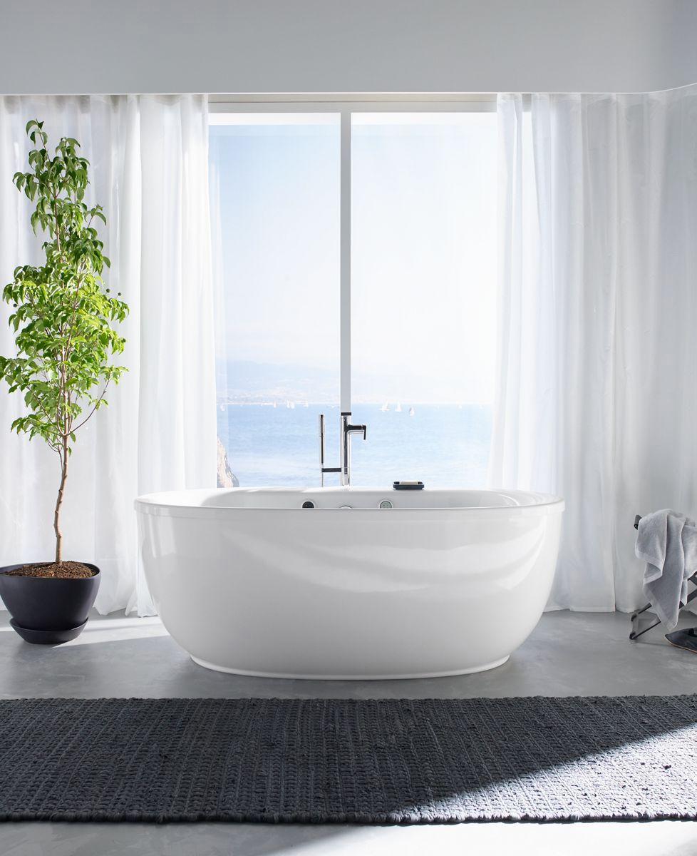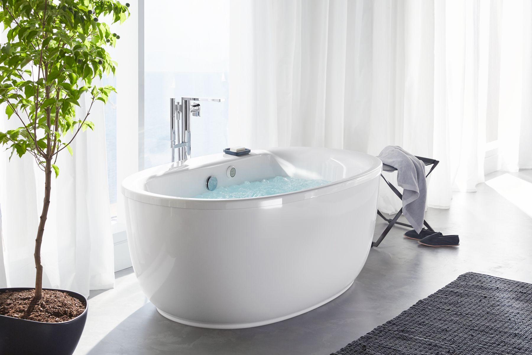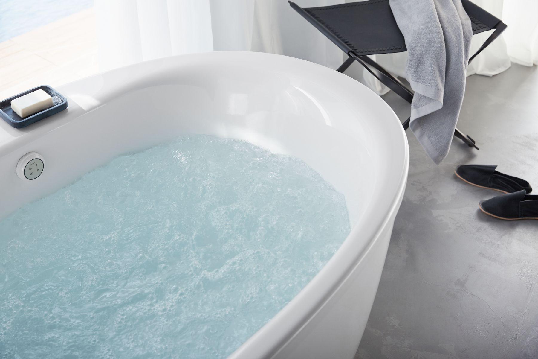 Completely surround your body in a soothing cushion of heated massaging bubbles in this Sunstruck freestanding air bath. With airjets pushing humidified air through the water, this bath delivers a blissfully warm, invigorating full-body massage experience. The oval, ergonomic design supports your body for a deep, relaxing soak. With its gracefully shaped lines and fluted shroud, this versatile bath complements a wide range of bathroom styles and offers easy three-step installation.