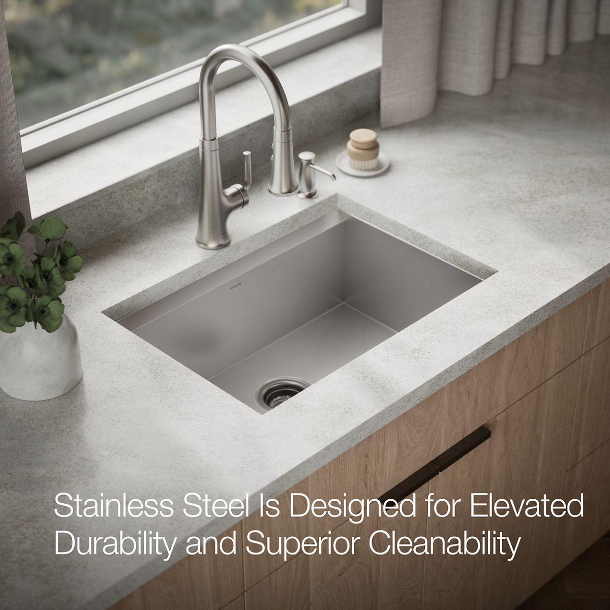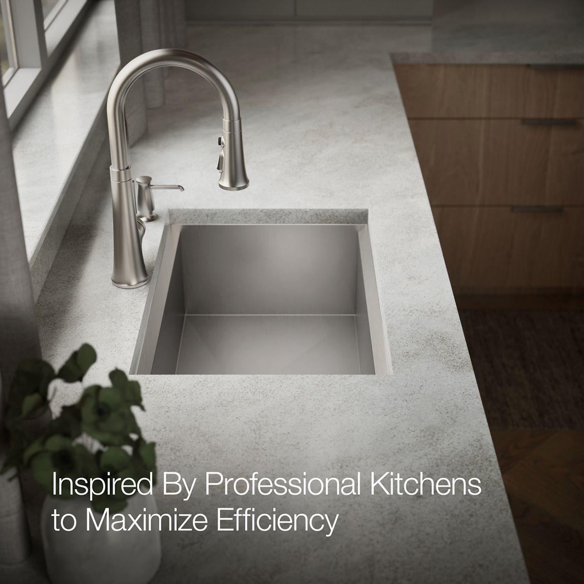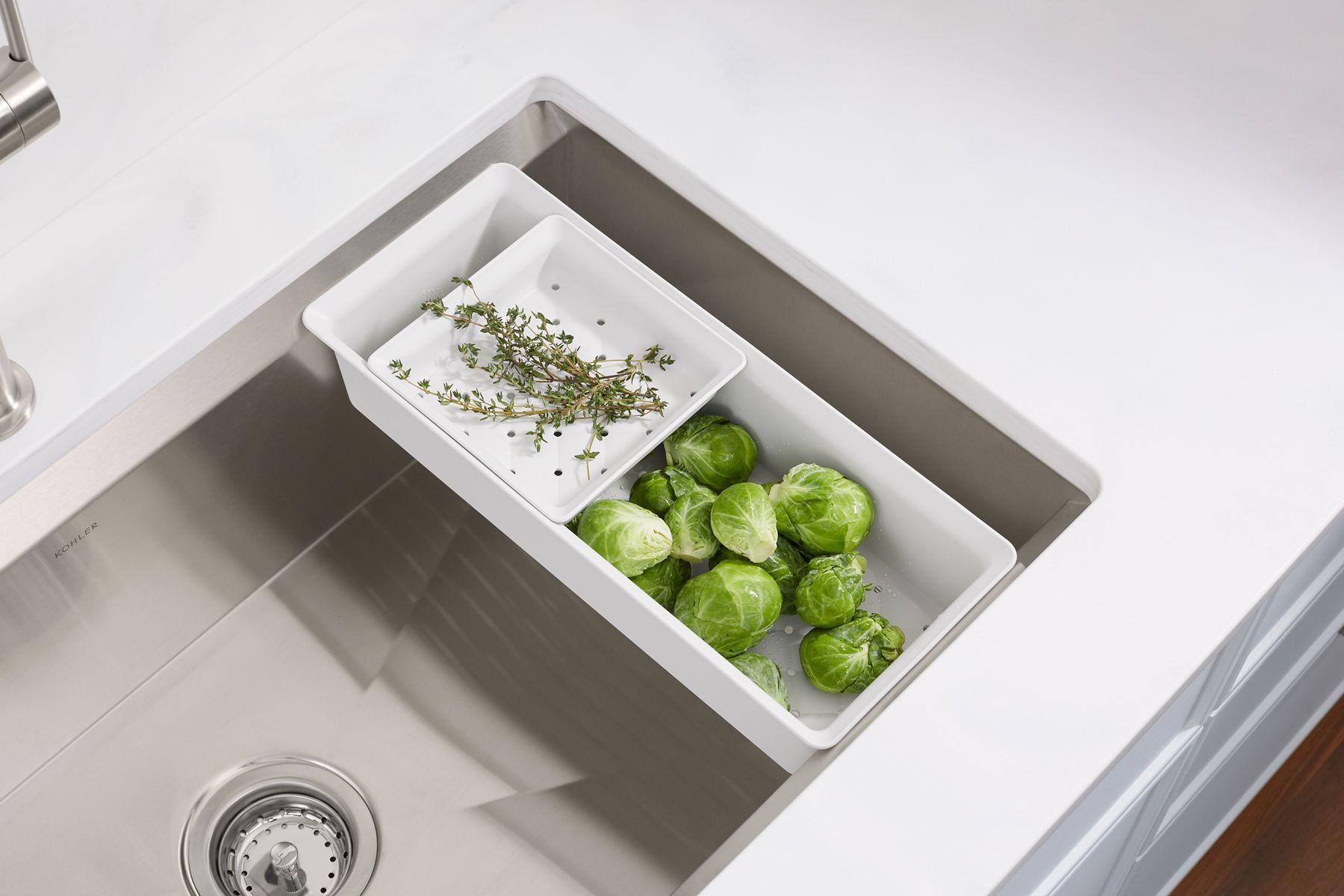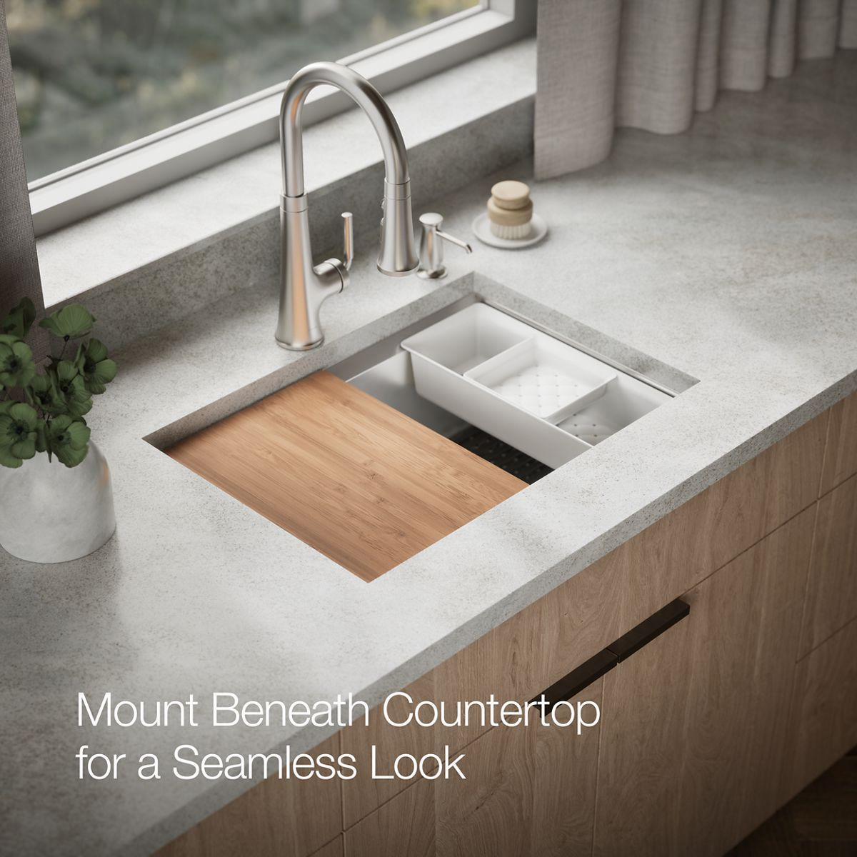 Imagine a kitchen sink with customized accessories that work with it so it works for you. Welcome to the Task workstation sink. Complete functionality packaged within a contemporary stainless steel design, the Task workstation sink makes food prep easier, with a two-piece nesting colander set and durable bamboo cutting board that each slide effortlessly within the sink to tailor your workstation for the task at hand. The dishwasher-safe silicone sink mat helps protect both your sink and fragile dishes from damage. This workstation sink gives the word “task” a whole new meaning.
