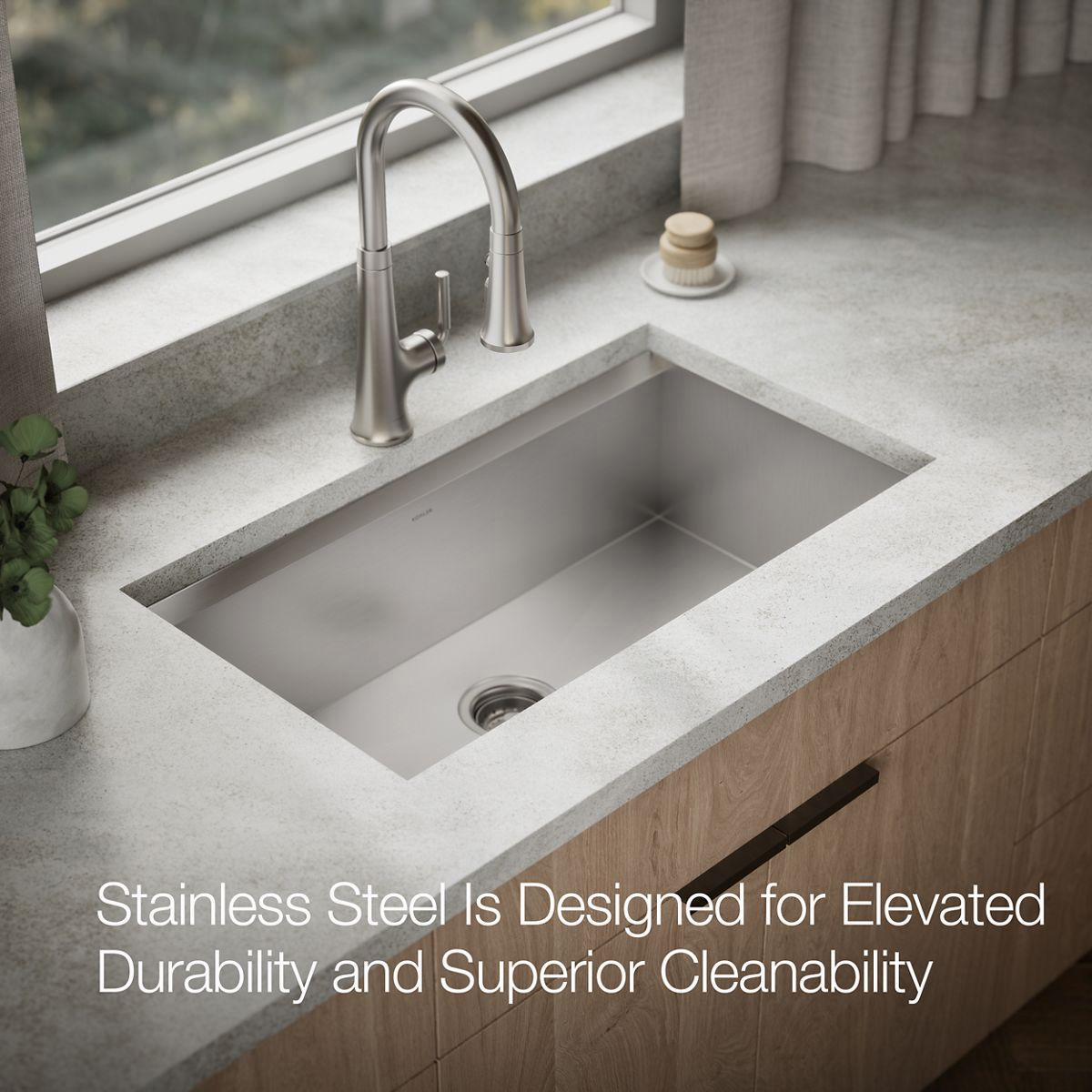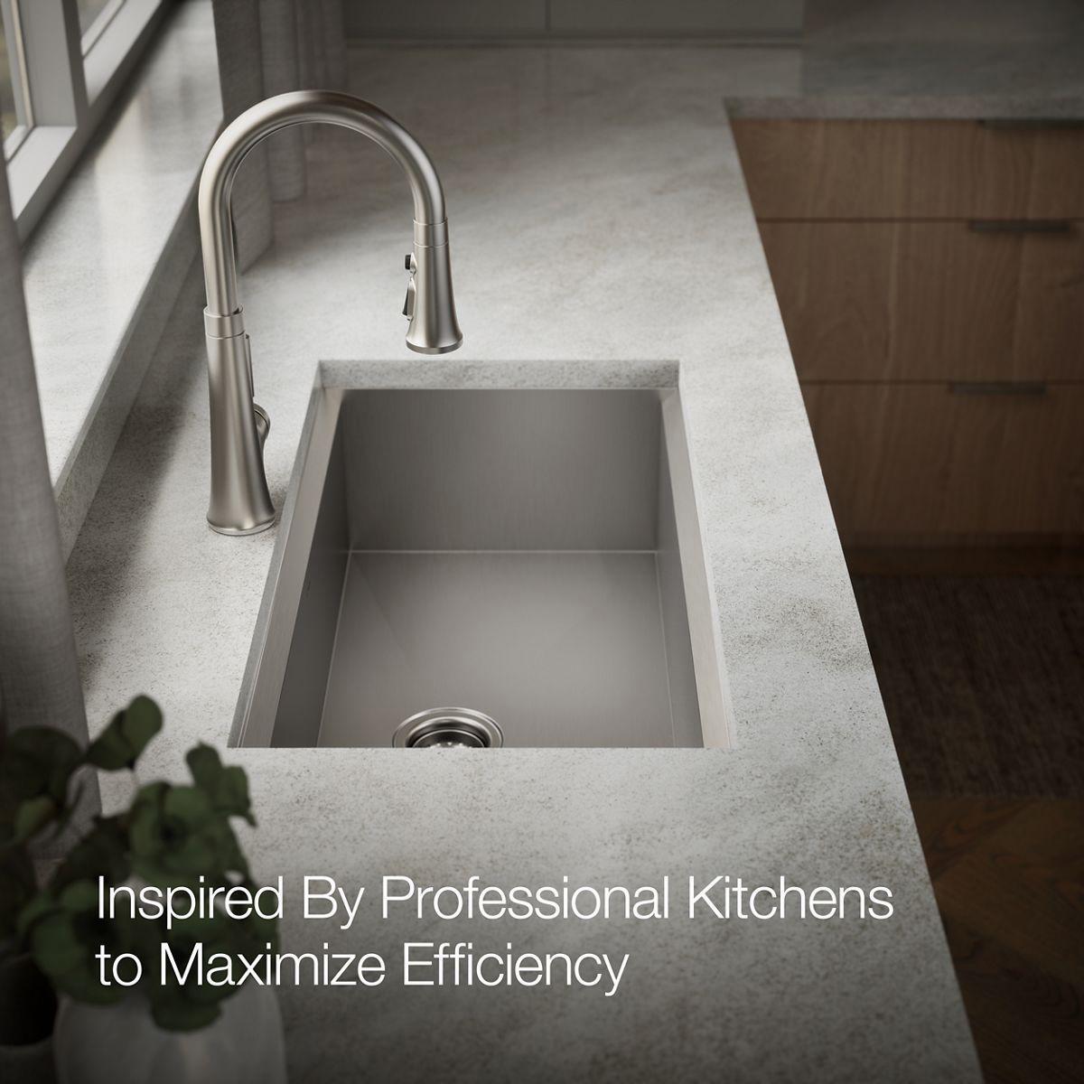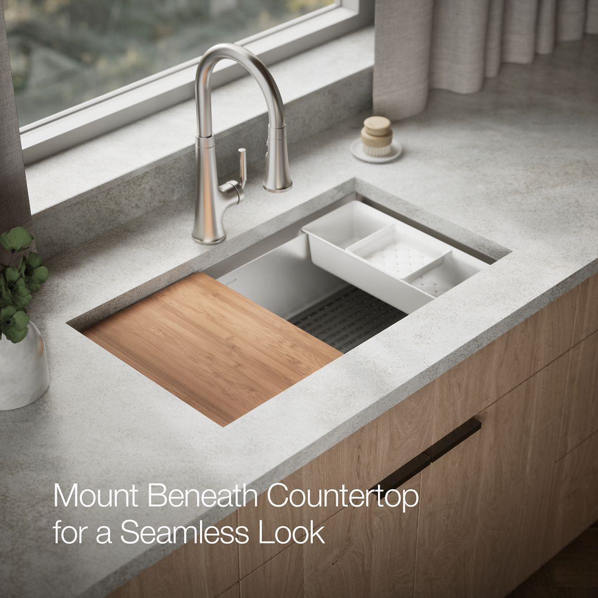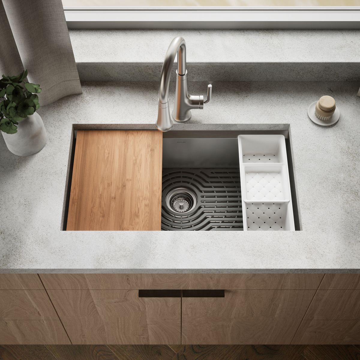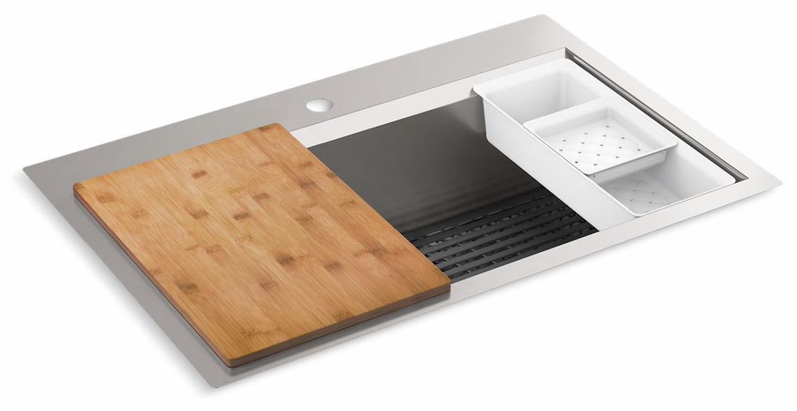 Imagine a kitchen sink with customized accessories that work with it so it works for you. Welcome to the Task workstation sink. Complete functionality packaged within a contemporary stainless steel design, the Task workstation sink makes food prep easier, with a two-piece nesting colander set and durable bamboo cutting board that each slide effortlessly within the sink to tailor your workstation for the task at hand. The dishwasher-safe silicone sink mat helps protect both your sink and fragile dishes from damage. This workstation sink gives the word “task” a whole new meaning.