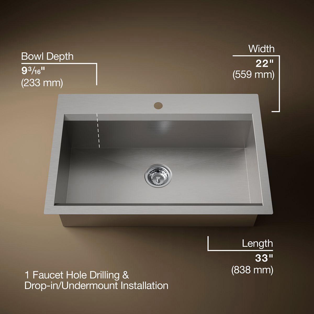 - Includes sink, two-piece colander set, bamboo cutting board, silicone sink mat, sink drain and strainer, installation hardware