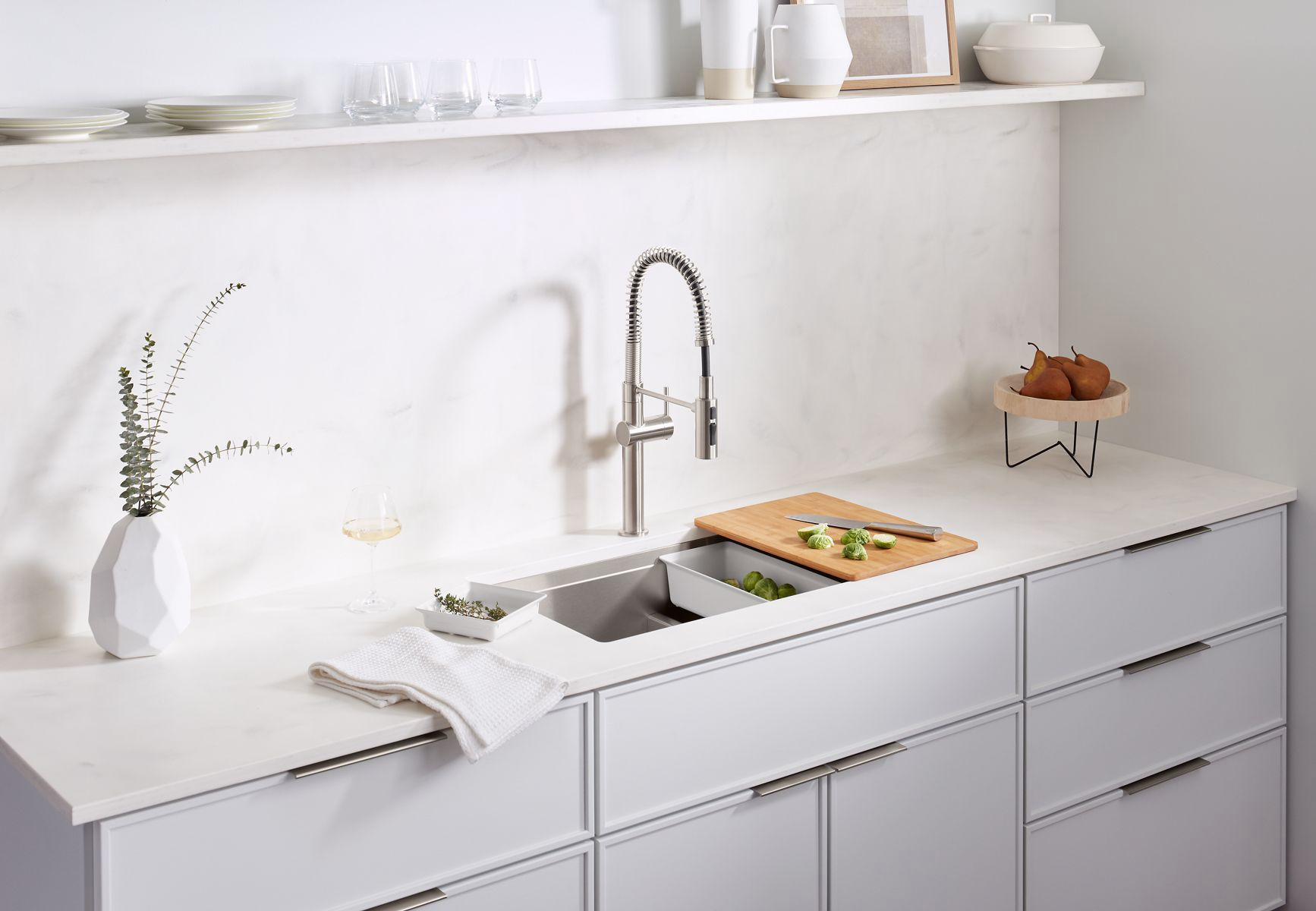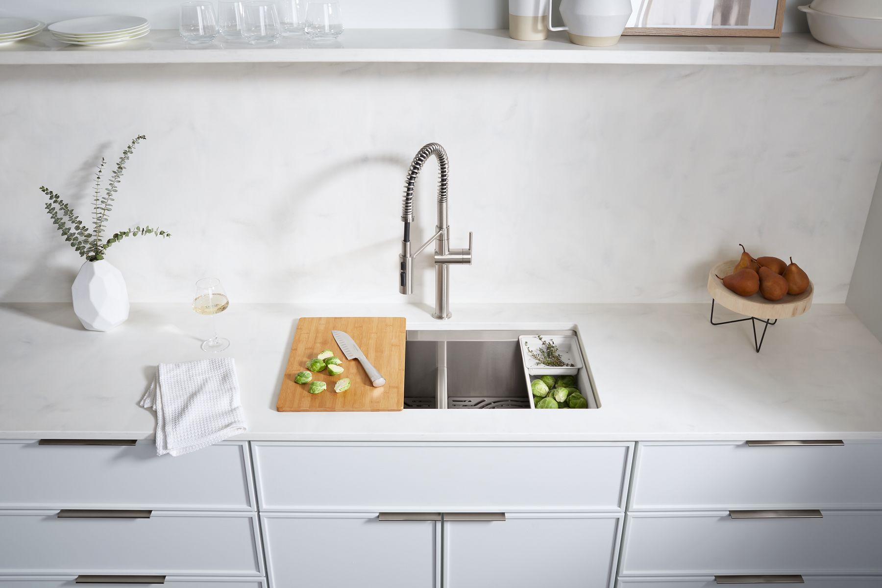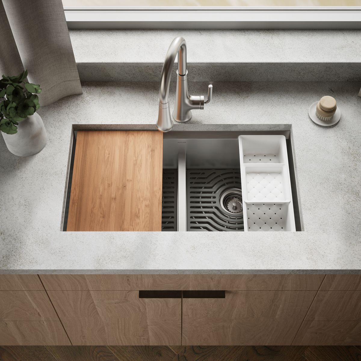 Imagine a kitchen sink with customized accessories that work with it so it works for you. Welcome to the Task workstation sink. Complete functionality packaged within a contemporary stainless steel design, the Task workstation sink makes food prep easier, with a two-piece nesting colander set and durable bamboo cutting board that each slide effortlessly within the sink to tailor your workstation for the task at hand. The dishwasher-safe silicone sink mats help protect both your sink and fragile dishes from damage. This workstation sink gives the word “task” a whole new meaning.