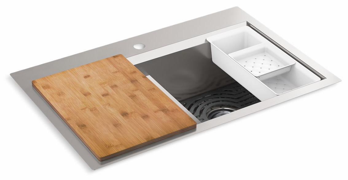 - Includes sink, two-piece colander set, bamboo cutting board, silicone sink mats, sink drains and strainers, installation hardware