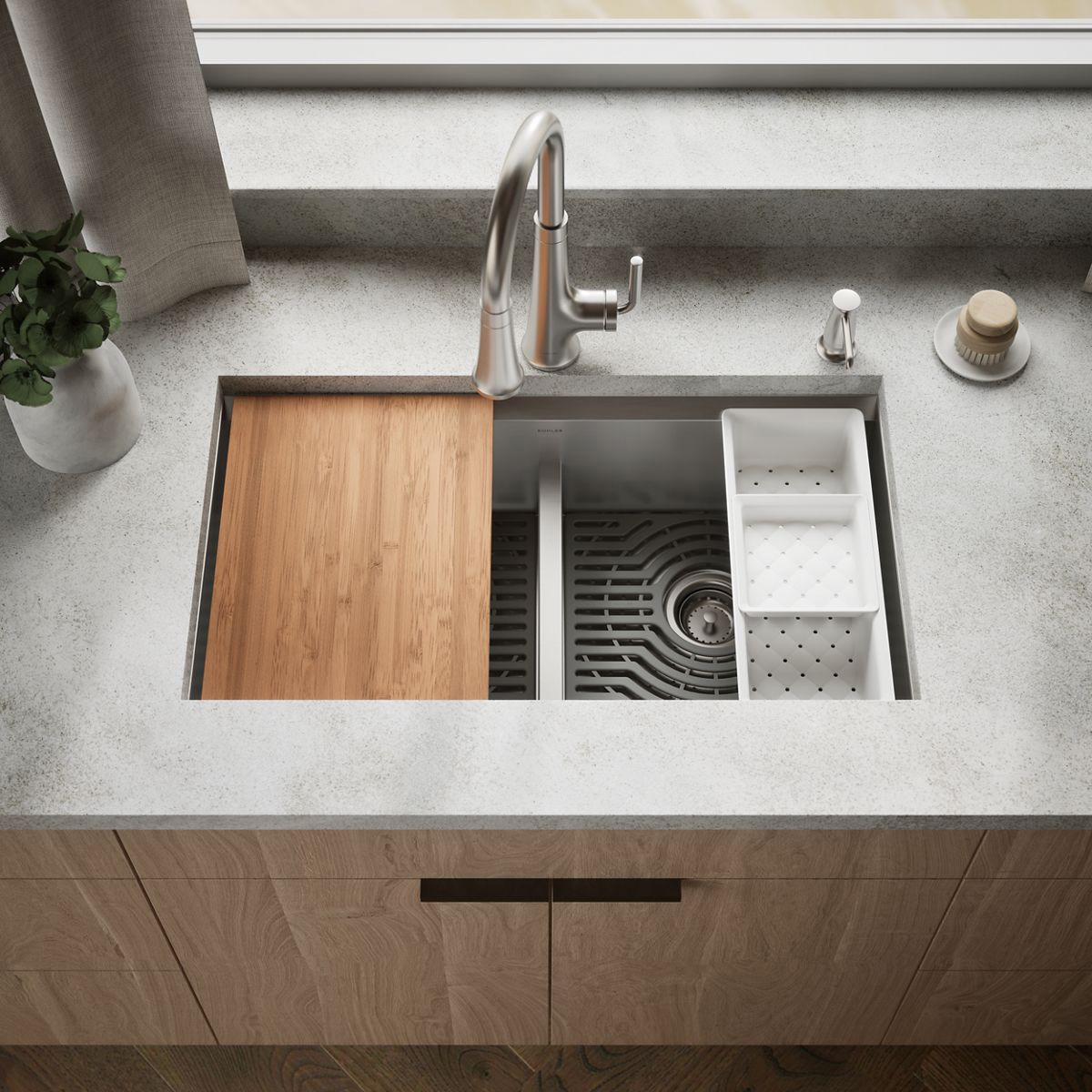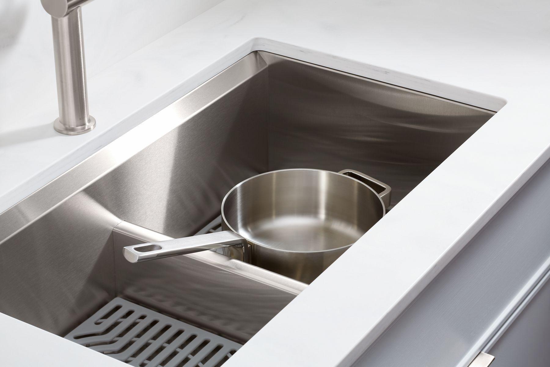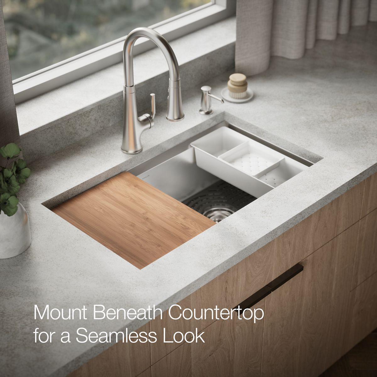 Imagine a kitchen sink with customized accessories that work with it so it works for you. Welcome to the Task workstation sink. Complete functionality packaged within a contemporary stainless steel design, the Task workstation sink makes food prep easier, with a two-piece nesting colander set and durable bamboo cutting board that each slide effortlessly within the sink to tailor your workstation for the task at hand. The dishwasher-safe silicone sink mats help protect both your sink and fragile dishes from damage. This workstation sink gives the word “task” a whole new meaning.