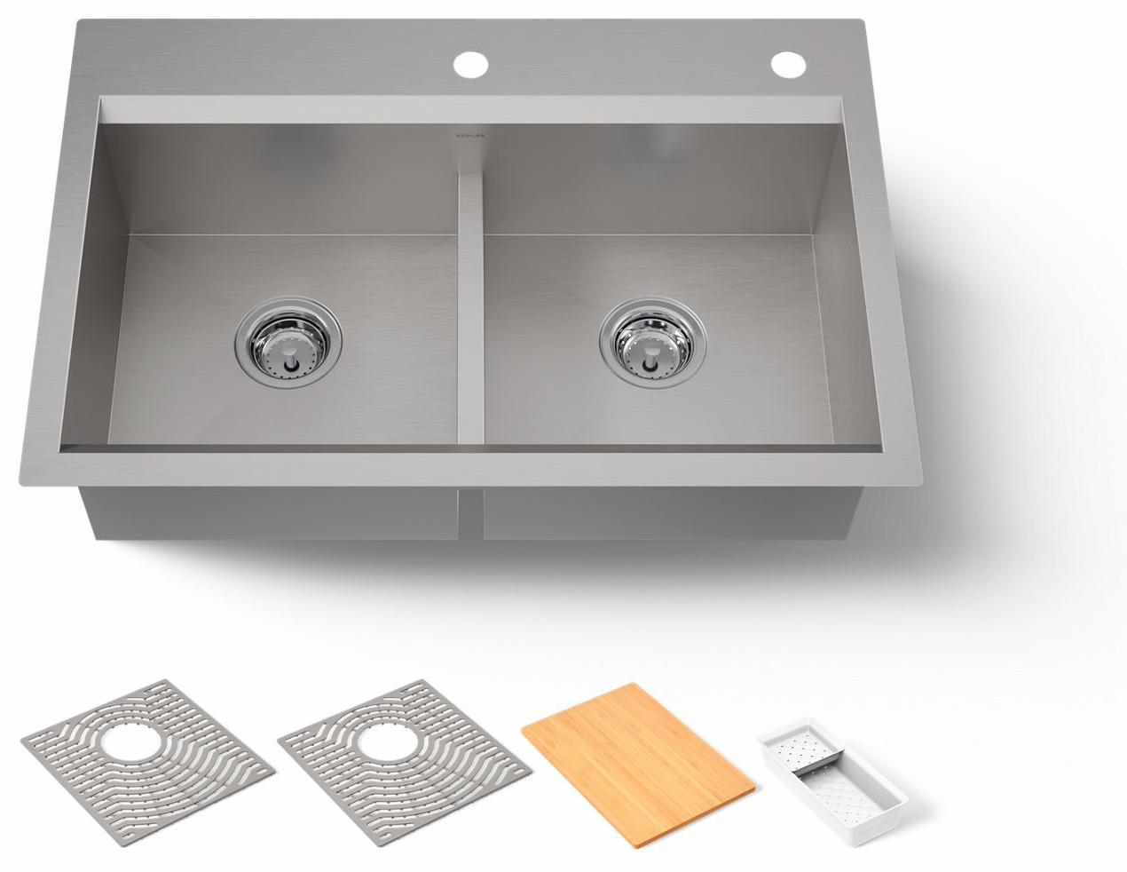 - Includes sink, two-piece colander set, bamboo cutting board, silicone sink mats, sink drains and strainers, installation hardware