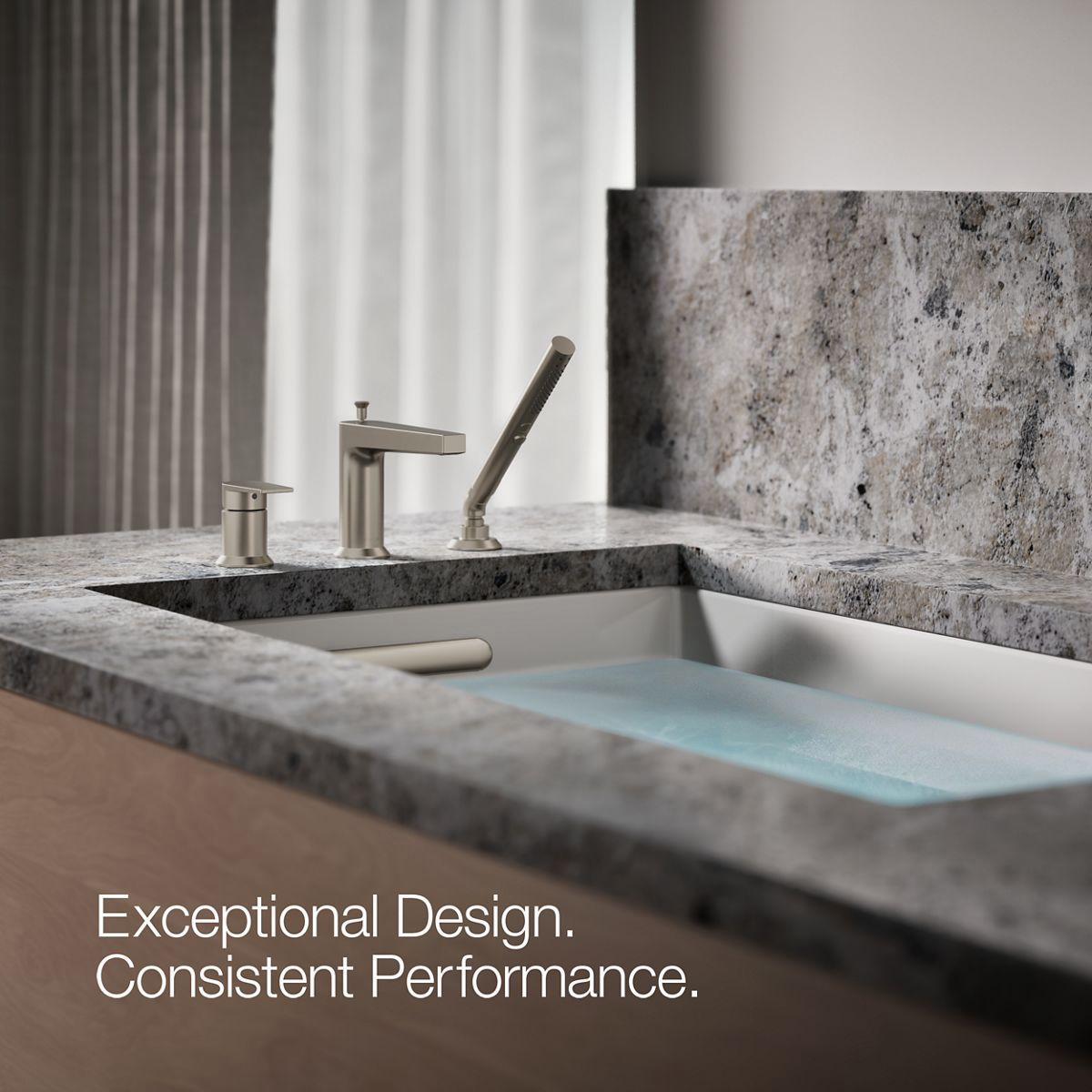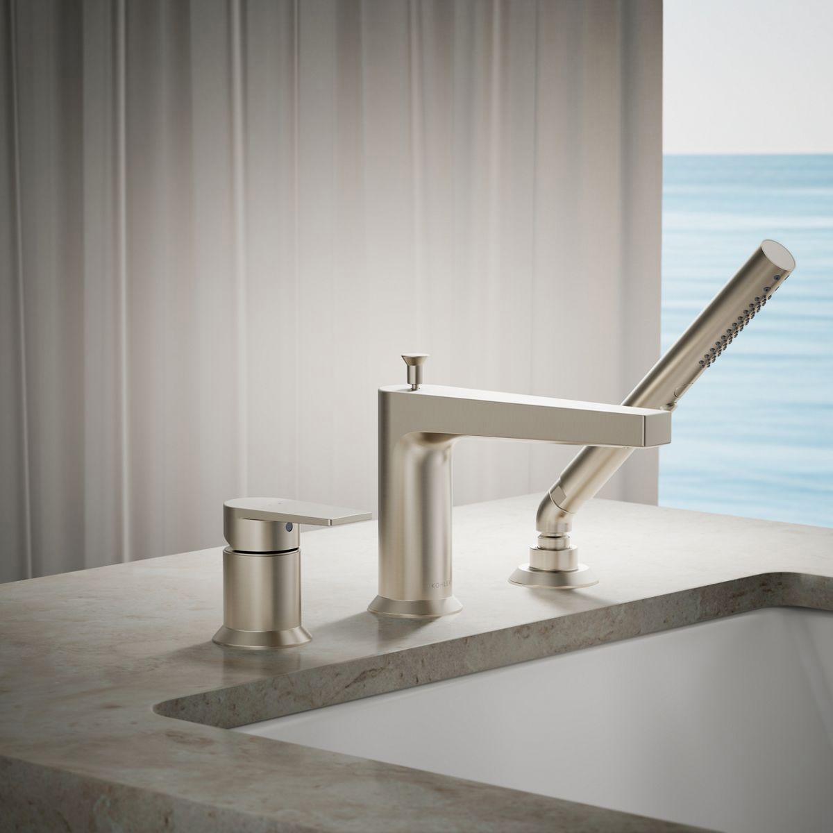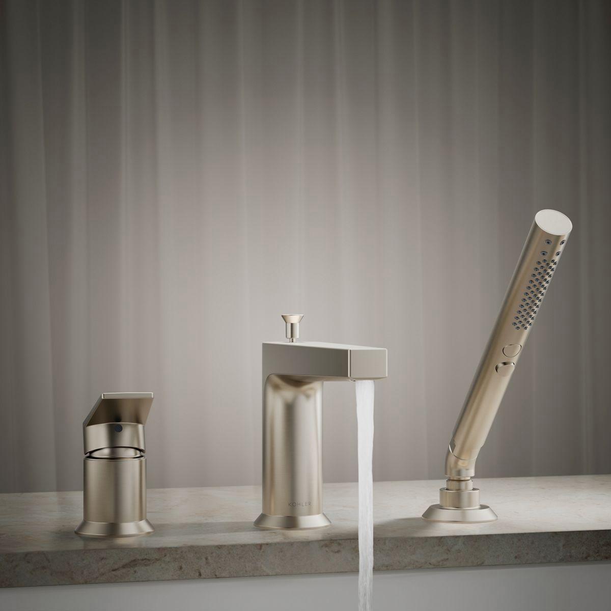 Minimalist in its design, the Taut bathroom faucet collection is a versatile style choice for transitional or contemporary environments. Coordinate with KOHLER Pitch showering components, and create a space that will look beautiful for years to come. This deck-mount bath faucet includes a handshower to enhance your bathing options.