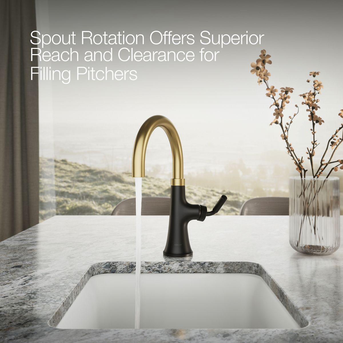 - High-arch swing spout with 155˚ rotation offers superior clearance for filling pitchers, chilling bottles and cleanup.