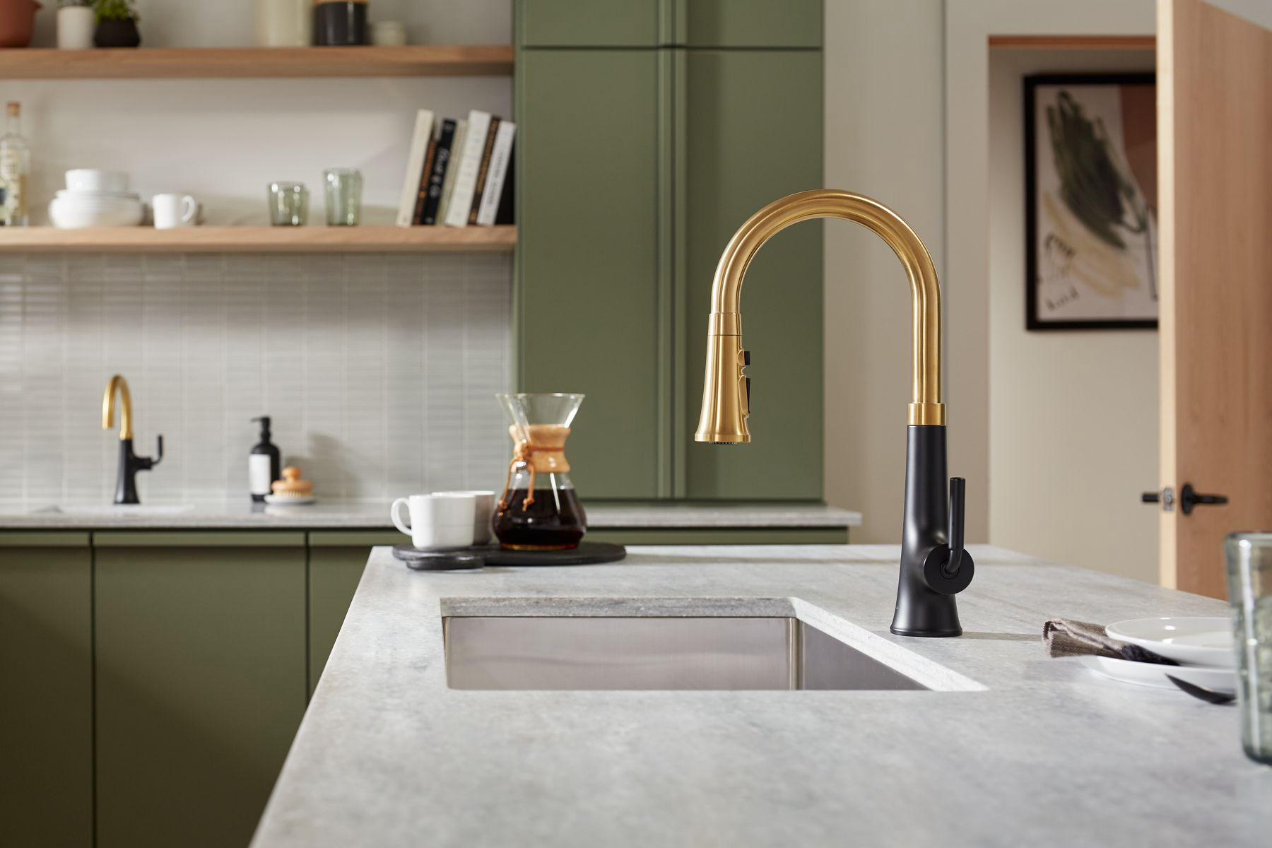 With clean lines and a soft teardrop base, the Tone kitchen faucet collection features a fresh take on mid-century modern style. This inviting design, where minimalism meets warmth, makes for a perfect fit in any space. Paired with thoughtful functionality, the Tone collection is a dynamic beauty.