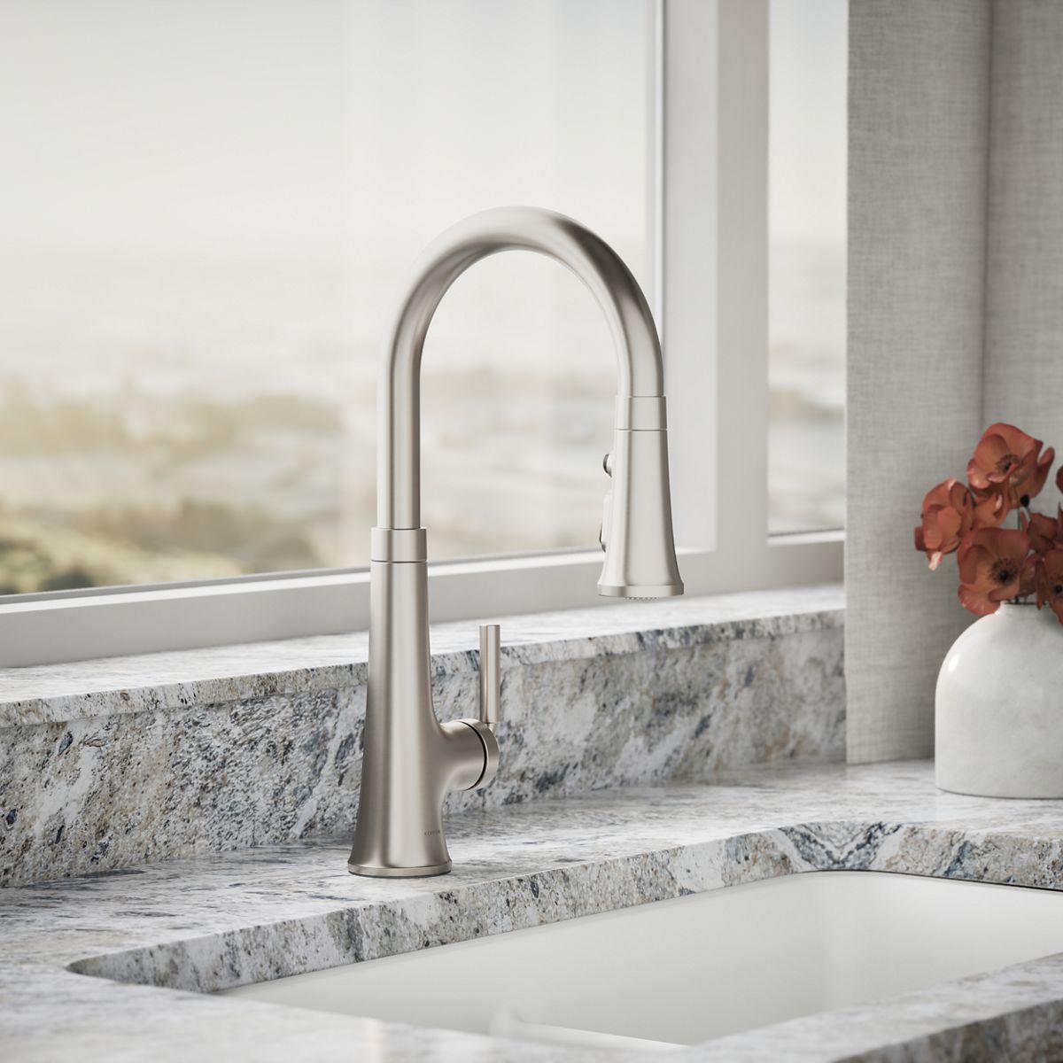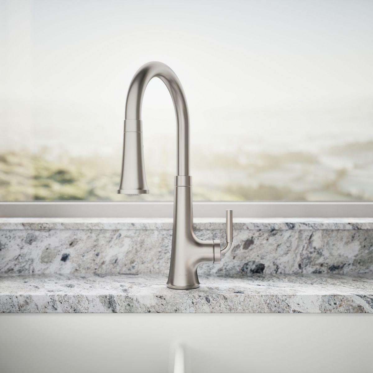 - Three-function pull-down sprayhead with touch control allows you to switch between aerated stream, Sweep® spray, and Boost technology.