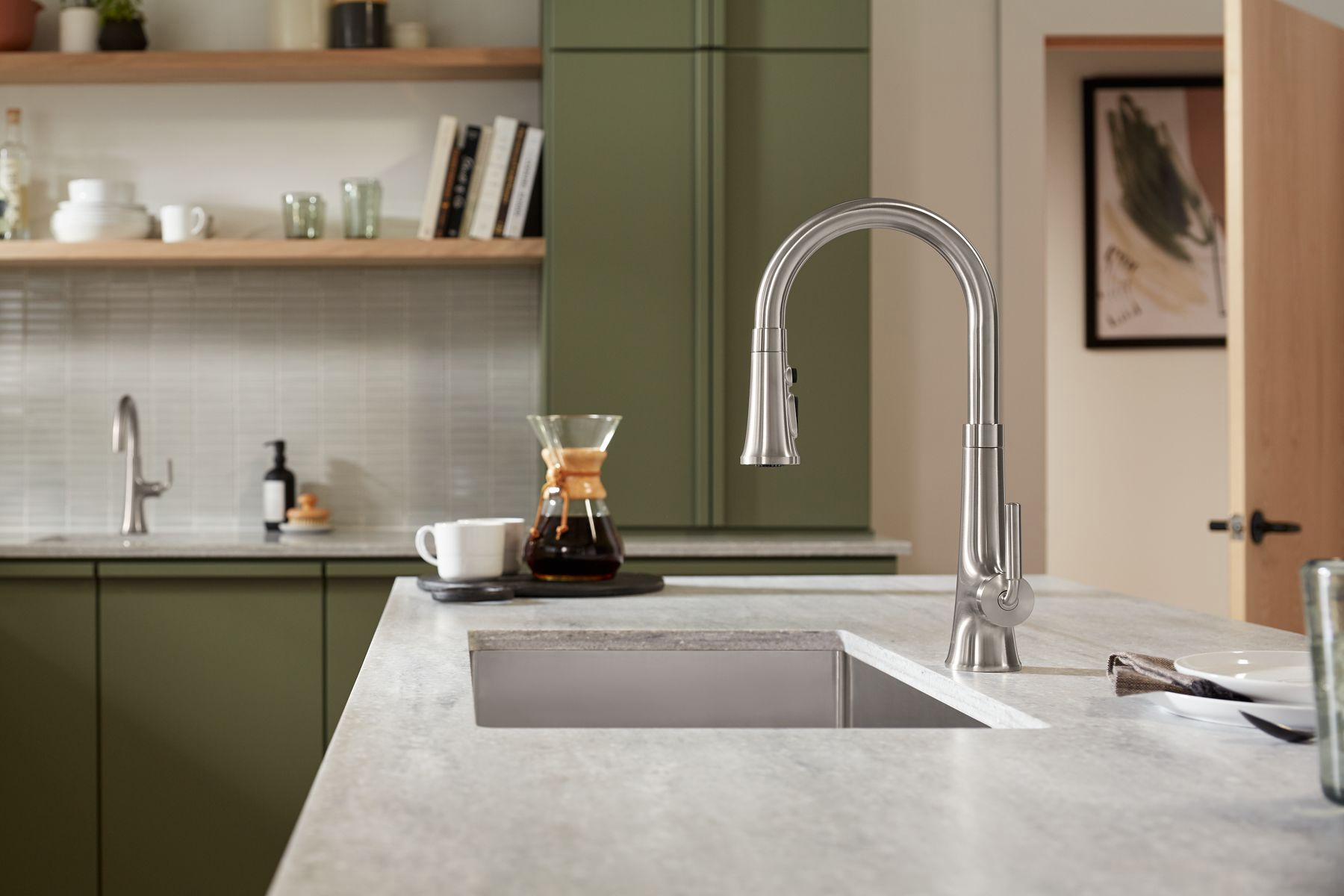 With clean lines and a soft teardrop base, the Tone kitchen faucet collection features a fresh take on mid-century modern style. This inviting design, where minimalism meets warmth, makes for a perfect fit in any space. Paired with thoughtful functionality, the Tone collection is a dynamic beauty.
