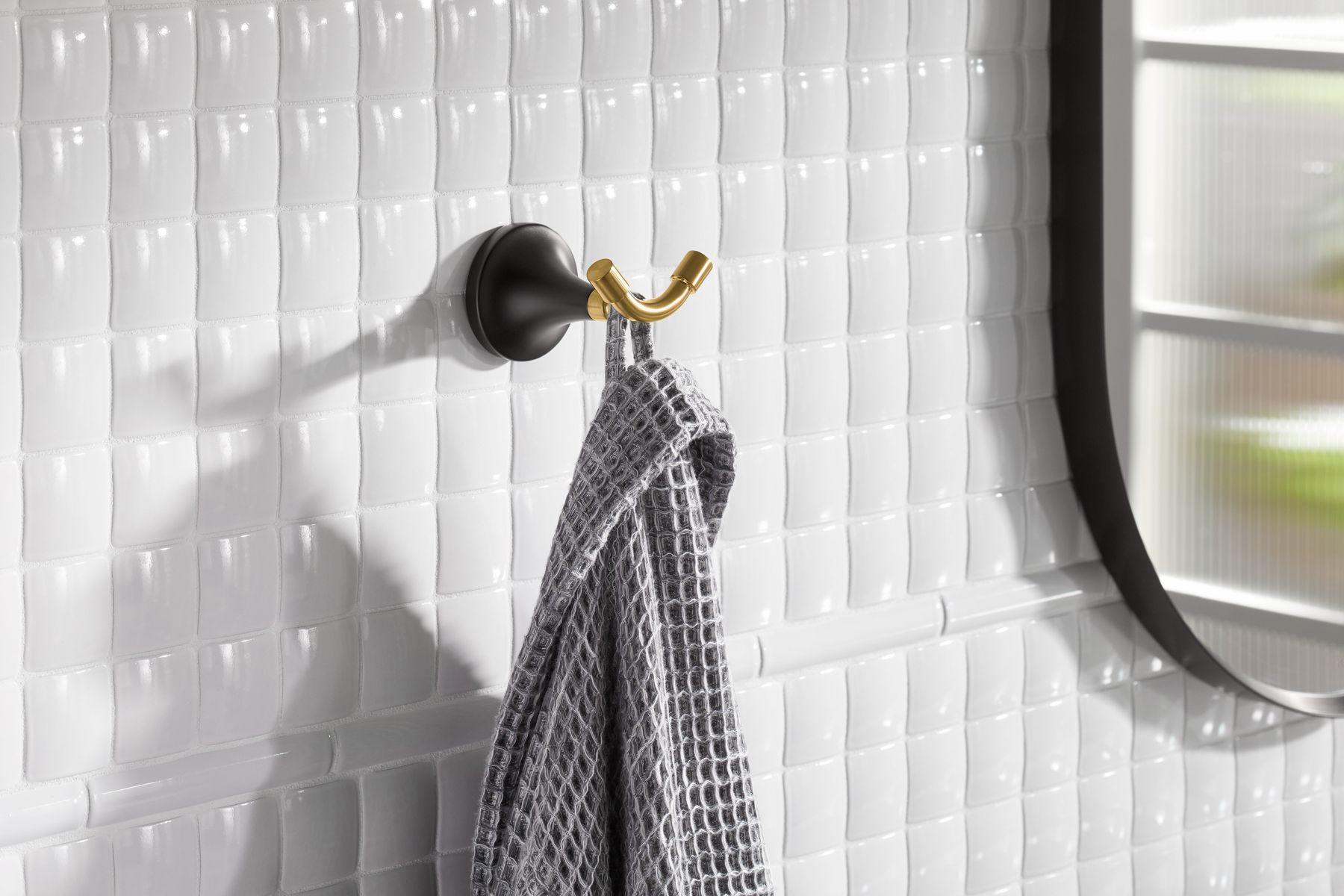 - Robe hook provides convenient hanging storage for robes, towels, and other bath items