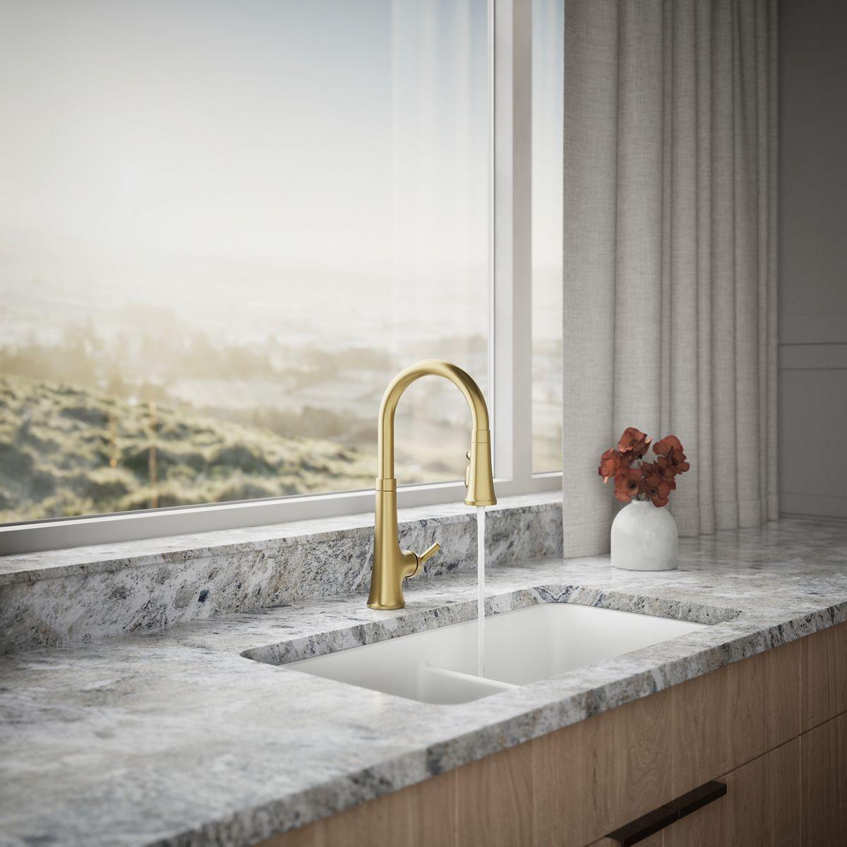 With clean lines and a soft teardrop base, the Tone kitchen faucet collection features a fresh take on mid-century modern style. This inviting design, where minimalism meets warmth, makes for a perfect fit in any space. Paired with thoughtful functionality, the Tone collection is a dynamic beauty.