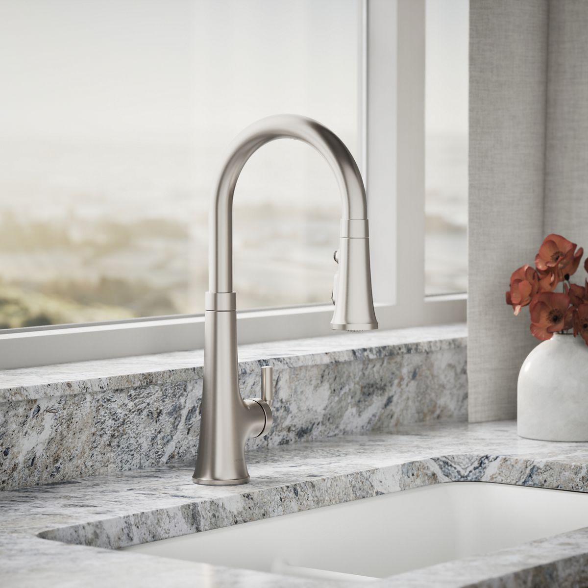- Three-function pull-down sprayhead with touch control allows you to switch between aerated stream, Sweep® spray, and Boost technology