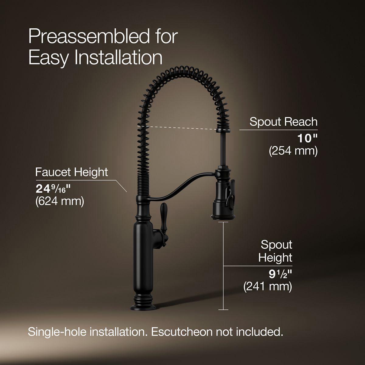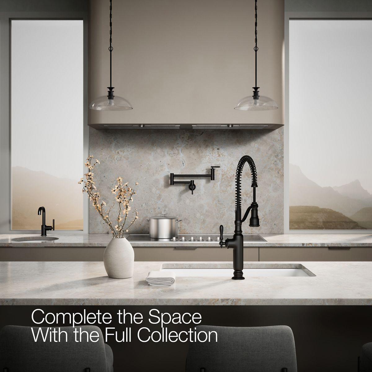 Designed with ambitious home chefs in mind, the Tournant faucet delivers elegant styling and professional performance to your kitchen. A unique three-function sprayhead lets you speed through a range of tasks: BerrySoft spray for food prep; an aerated stream for filling pots and pitchers; and Sweep spray for cleaning. The high-arching coil spring removes for easy cleaning.