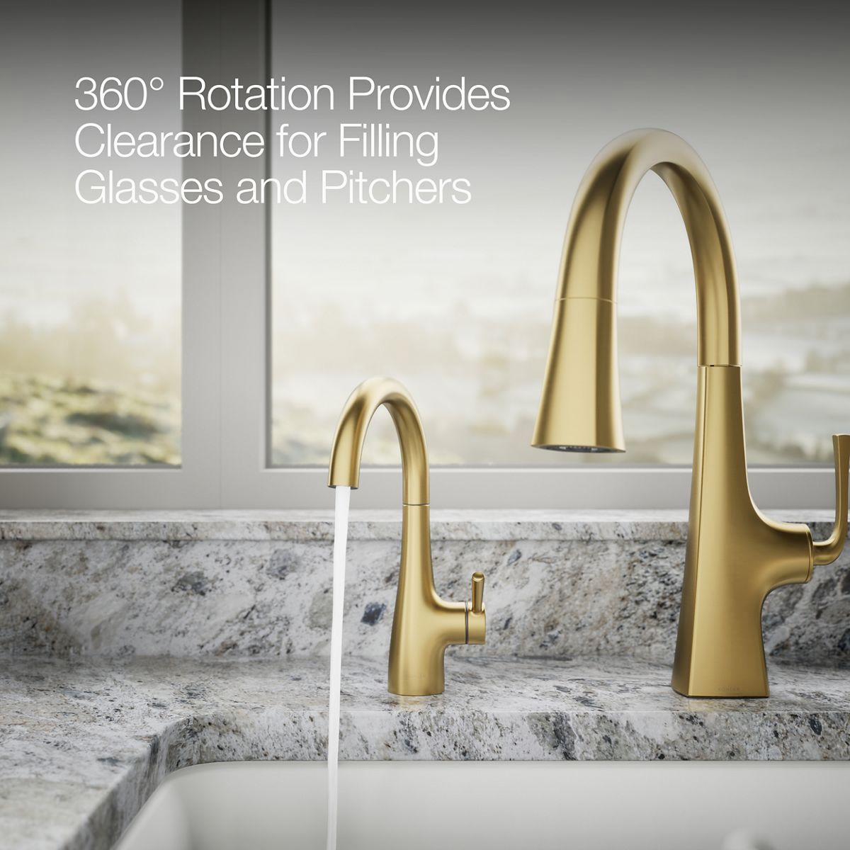 - Faucet spout rotates 360° and offers clearance for filling glasses and pitchers