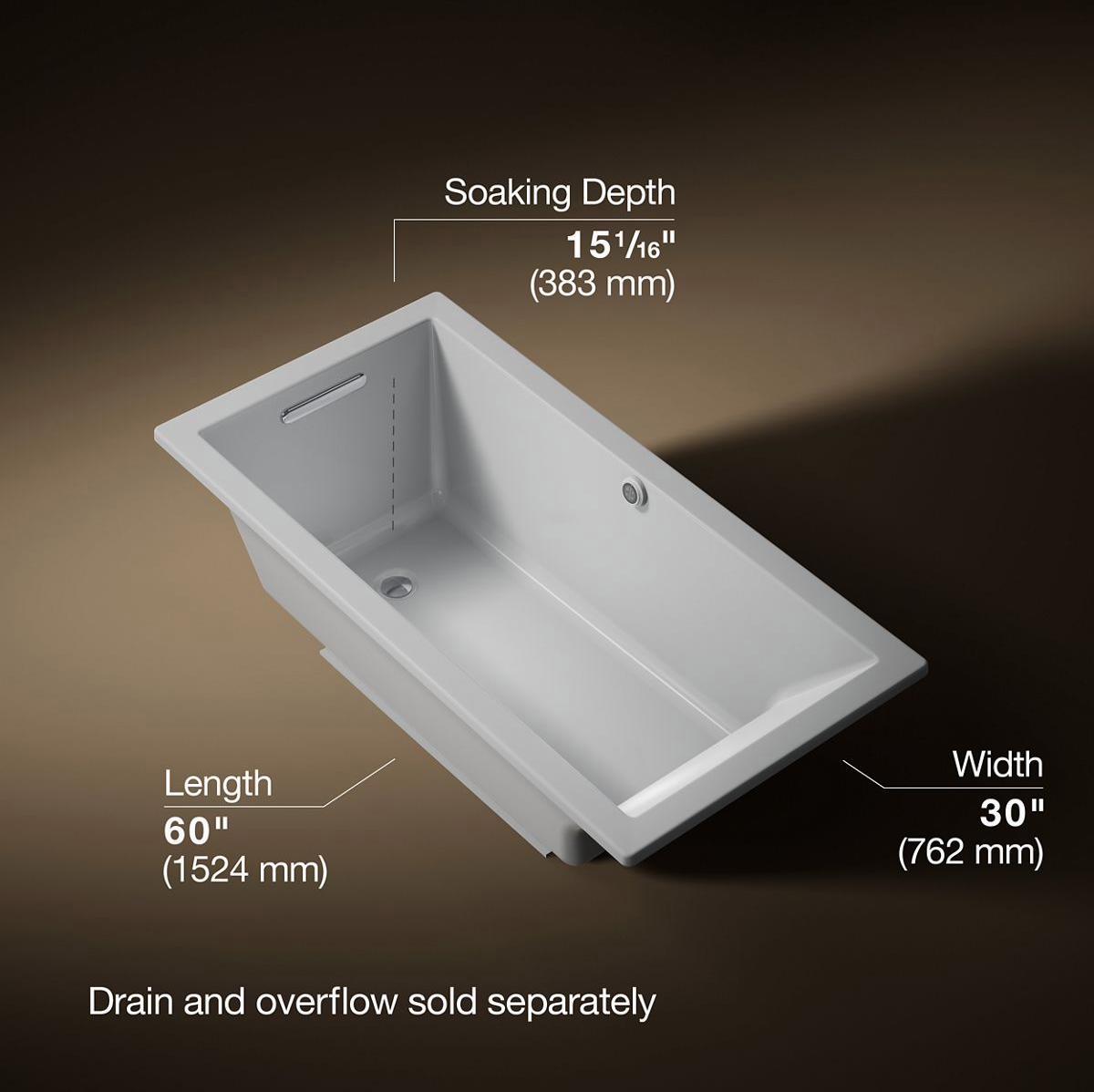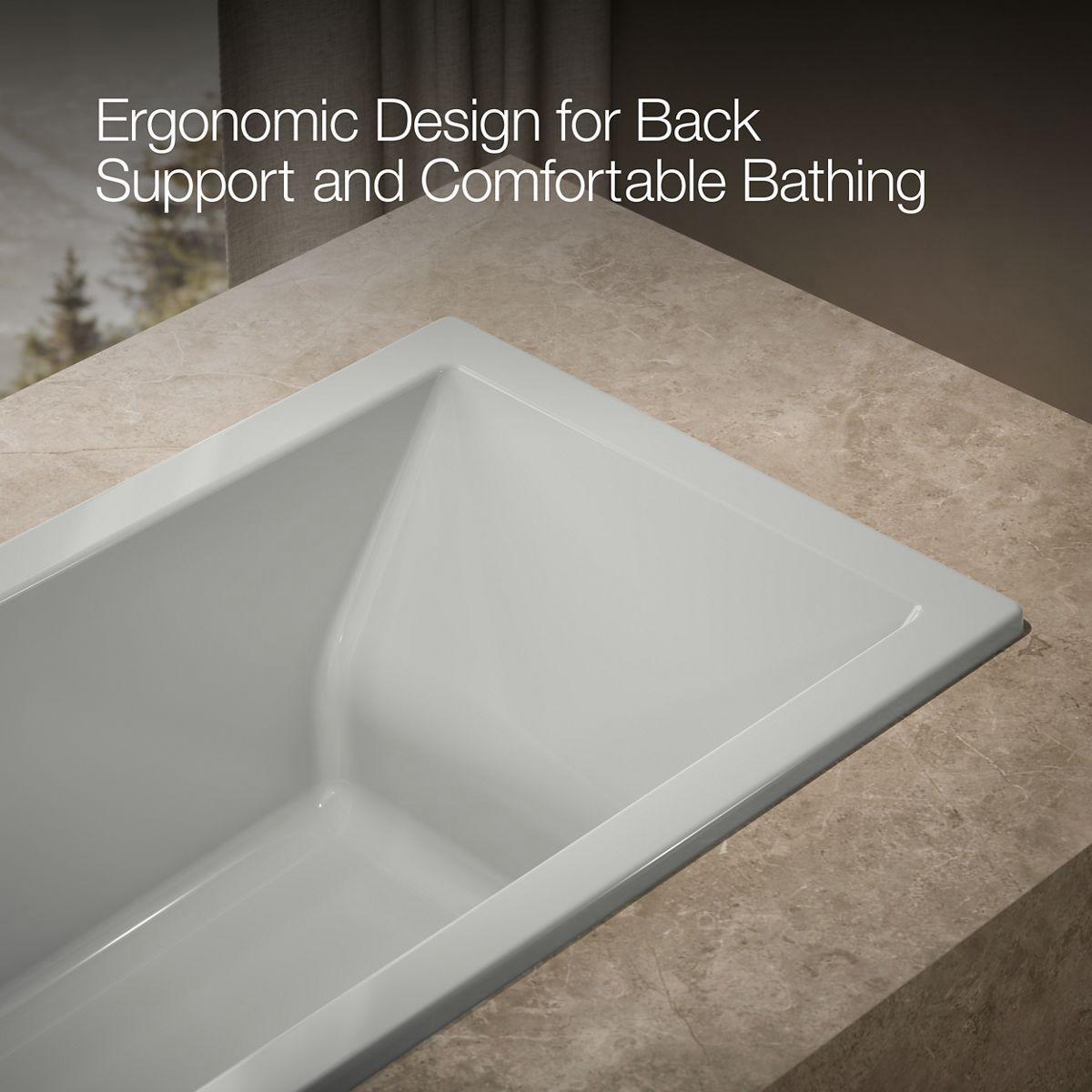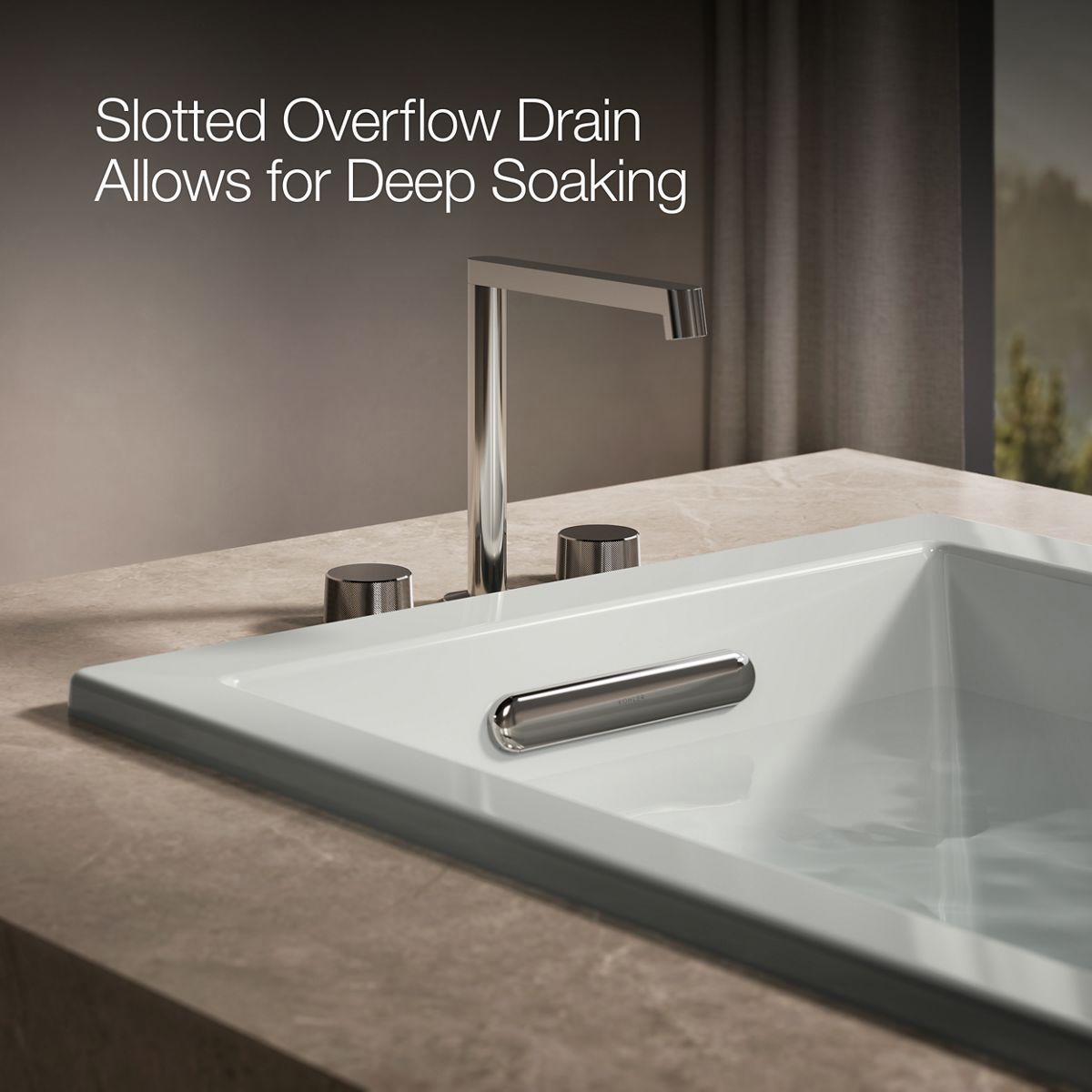 Streamlined for simplicity, this Underscore bath exudes refined style with contemporary flair. Its heated surface warms the back and neck with adjustable temperature settings to create a spa-like environment. A slotted overflow drain allows for a luxuriously deep bath as you relax against the comfortable sloped backrest.
