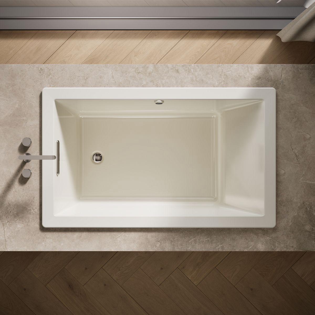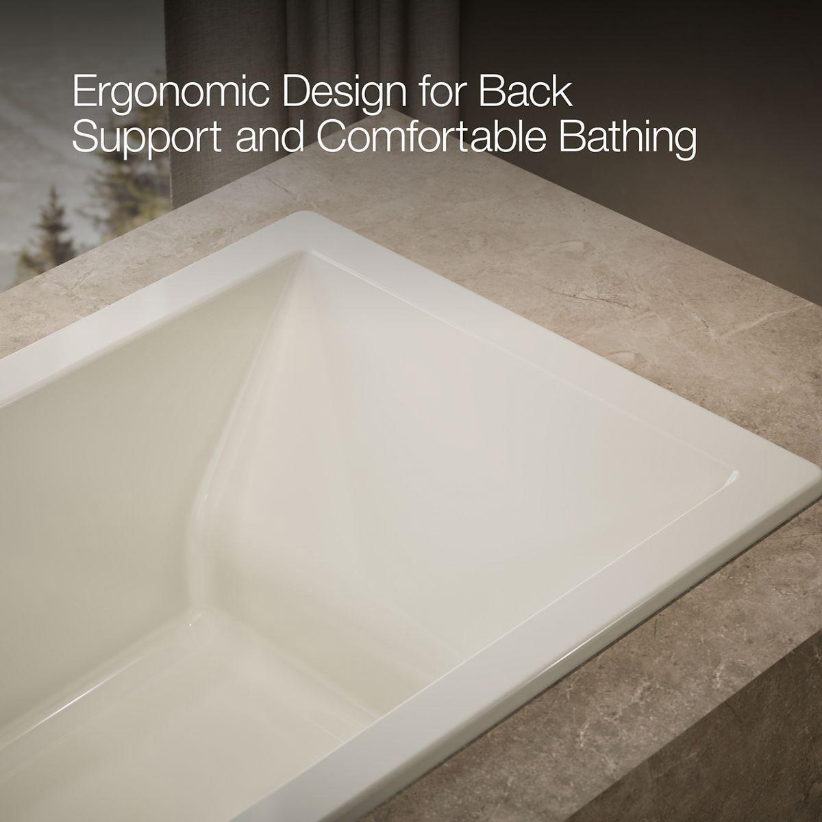 Streamlined for simplicity, this Underscore bath exudes refined style with contemporary flair. Its heated surface warms the back and neck with adjustable temperature settings to create a soothing, spa-like environment. A slotted overflow drain allows for a luxuriously deep bath as you relax against the comfortable sloped backrest.