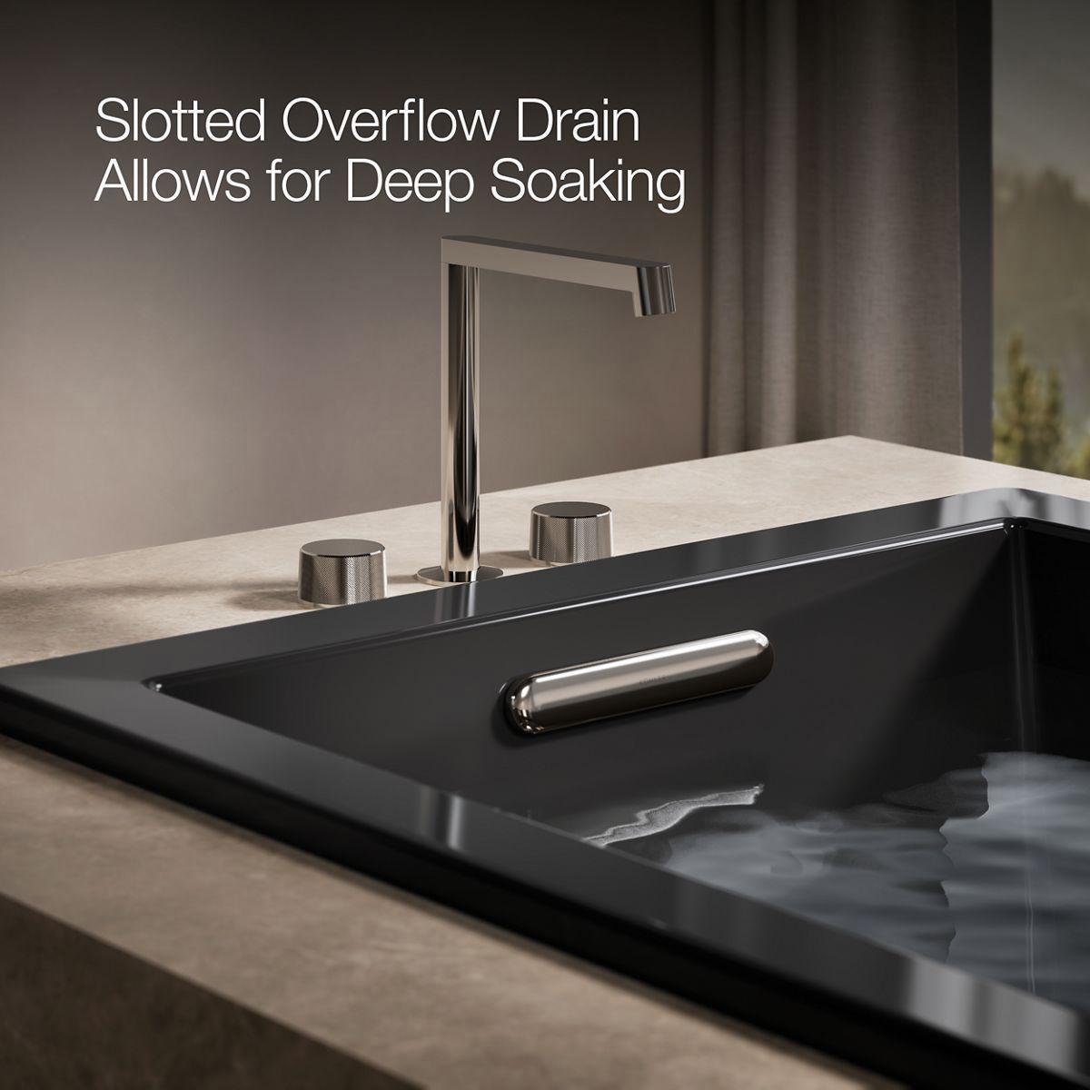 Streamlined for simplicity, this Underscore bath exudes refined style with contemporary flair. Its heated surface warms the back and neck with adjustable temperature settings to create a soothing, spa-like environment. A slotted overflow drain allows for a luxuriously deep bath as you relax against the comfortable sloped backrest.