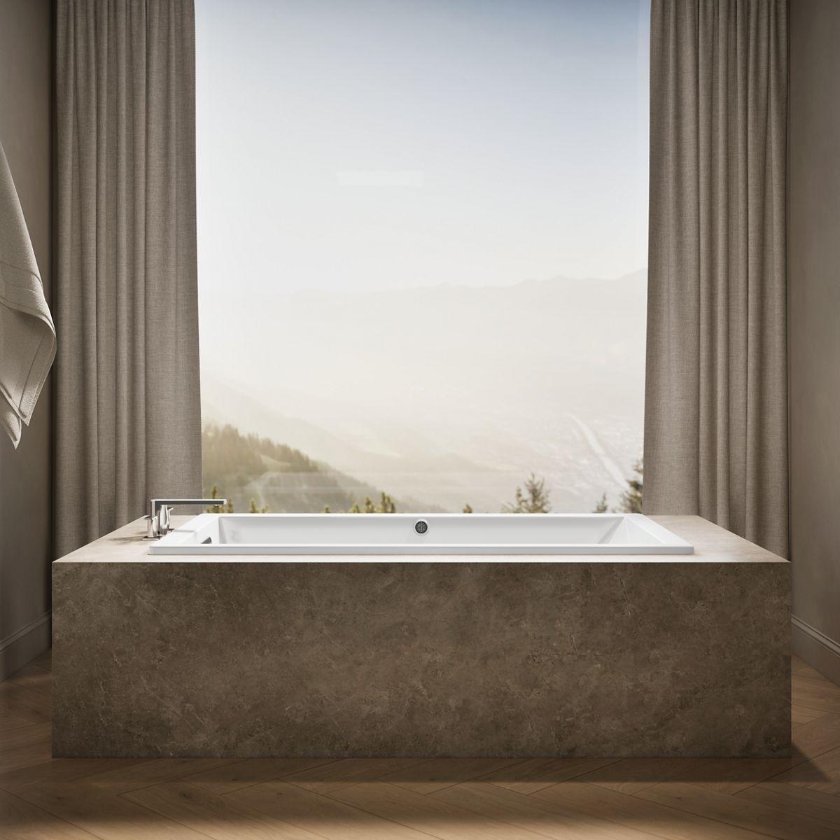 Streamlined for simplicity, this Underscore bath exudes refined style with contemporary flair. Its heated surface warms the back and neck with adjustable temperature settings to create a soothing, spa-like environment. A slotted overflow drain allows for a luxuriously deep bath as you relax against the comfortable sloped backrest.