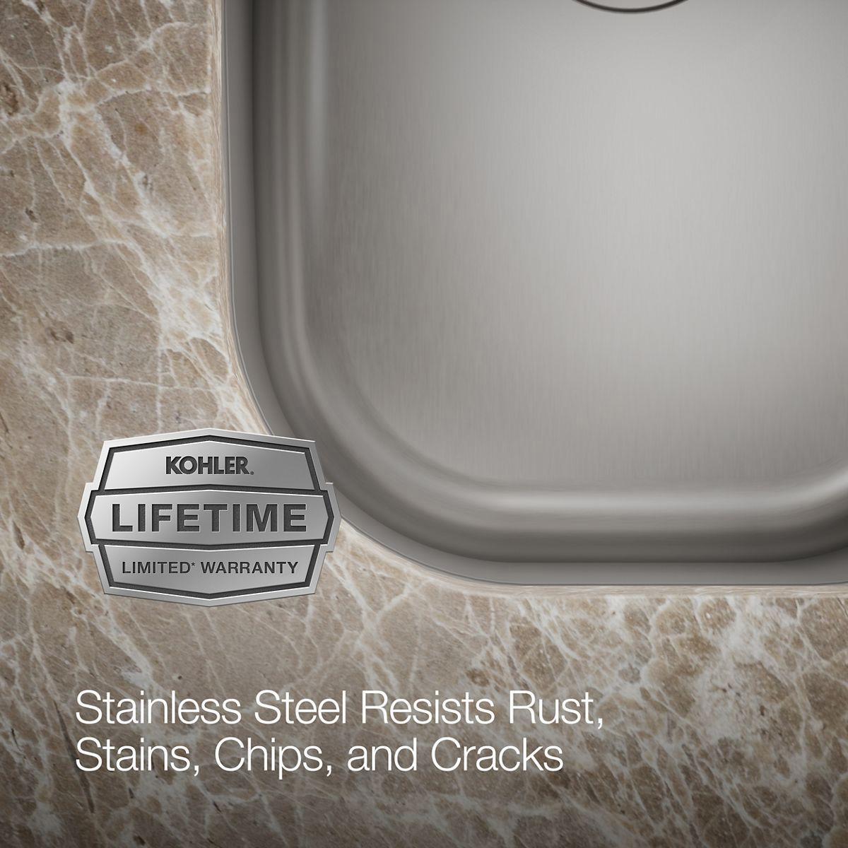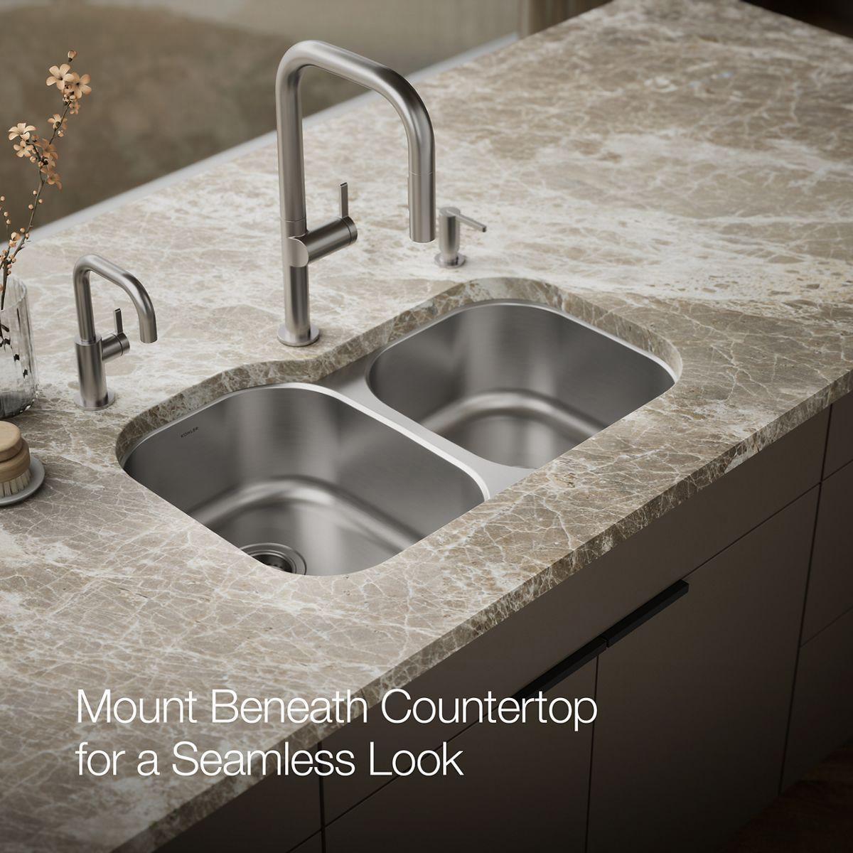 Constructed from premium stainless steel, Undertone brings home the durability, quiet performance, and polished look of professional kitchens. The large/medium bowls allow you to keep clean and dirty dishes separate while offering plenty of room for oversize pots and pans. A mirror-finish edge adds an elegant accent. An engineered sound-absorption system significantly reduces dishwashing and disposal noise.