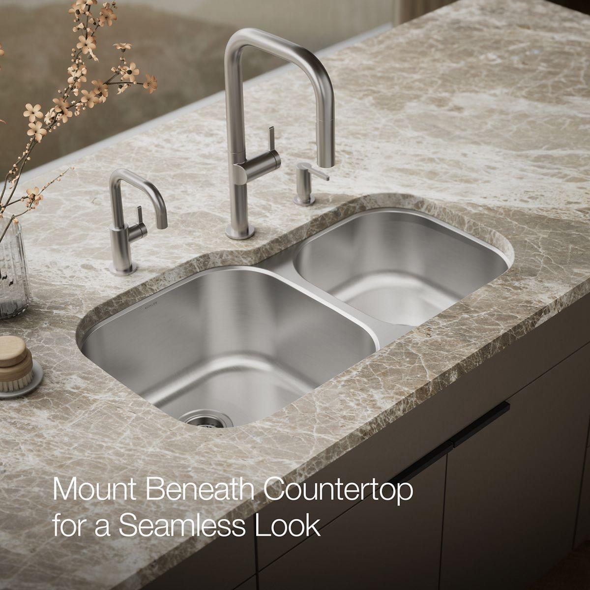 Constructed from premium stainless steel, Undertone brings home the durability, quiet performance, and polished look of professional kitchens. This sink features an engineered sound-absorption system that significantly reduces dishwashing and disposal noise. The extra-large/medium bowls allow you to keep clean and dirty dishes separate while offering plenty of room for oversize pots and pans. A mirror-finish edge adds an elegant accent.