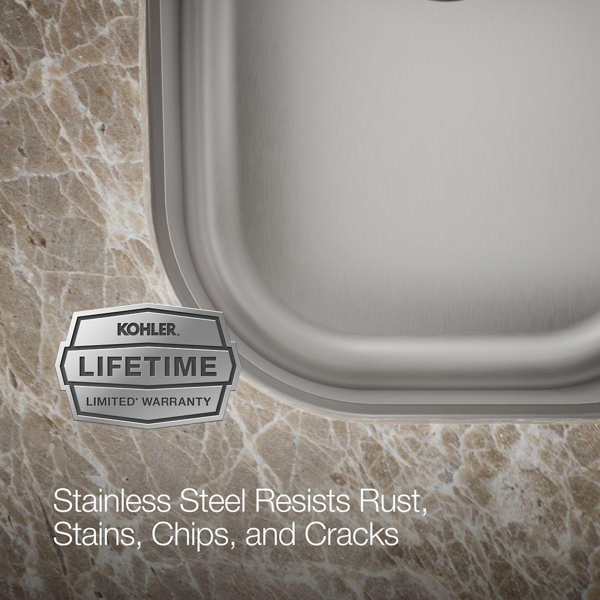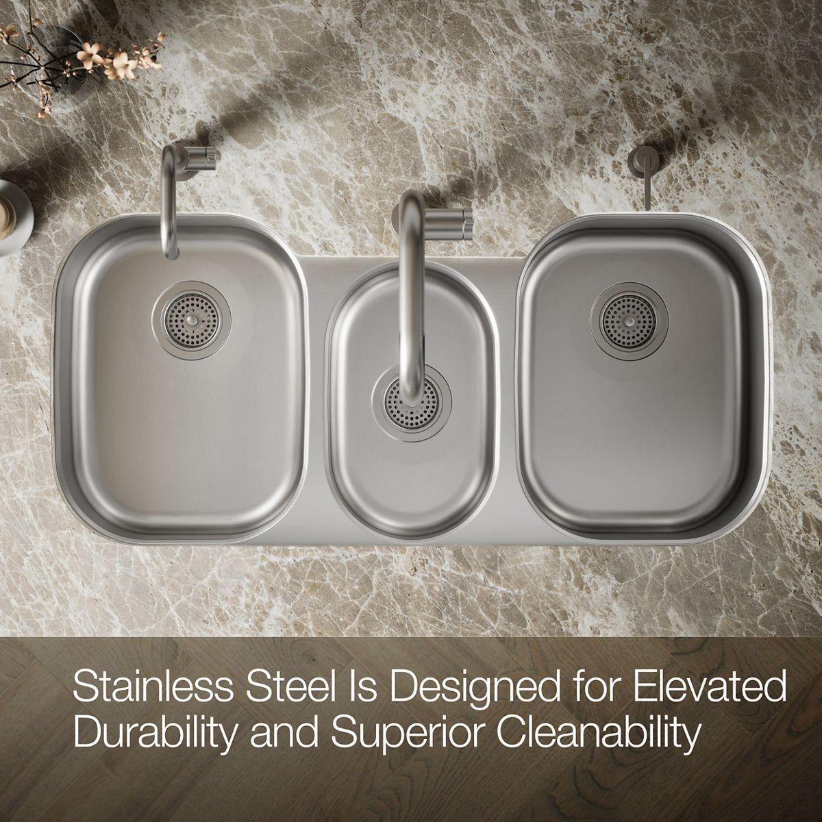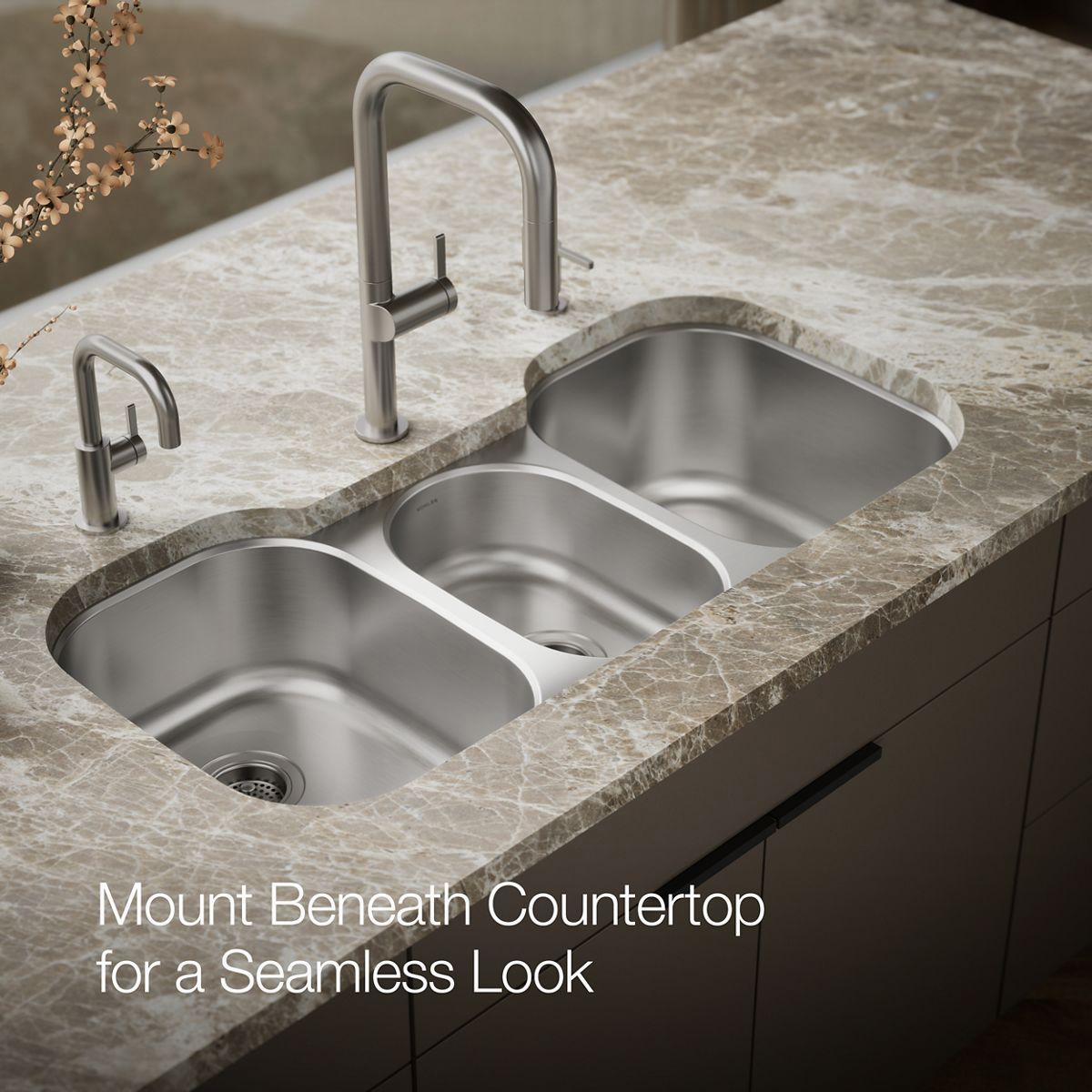 This Undertone triple-bowl sink sets the stage for ultimate efficiency in the kitchen, whether you're preparing everyday meals or entertaining a crowd. A shallow center bowl is flanked by two larger bowls of varying depths, providing a spacious and flexible workspace. A mirror-finish edge adds an elegant accent. Constructed from premium stainless steel, this sink features an engineered sound-absorption system that significantly reduces dishwashing and disposal noise.