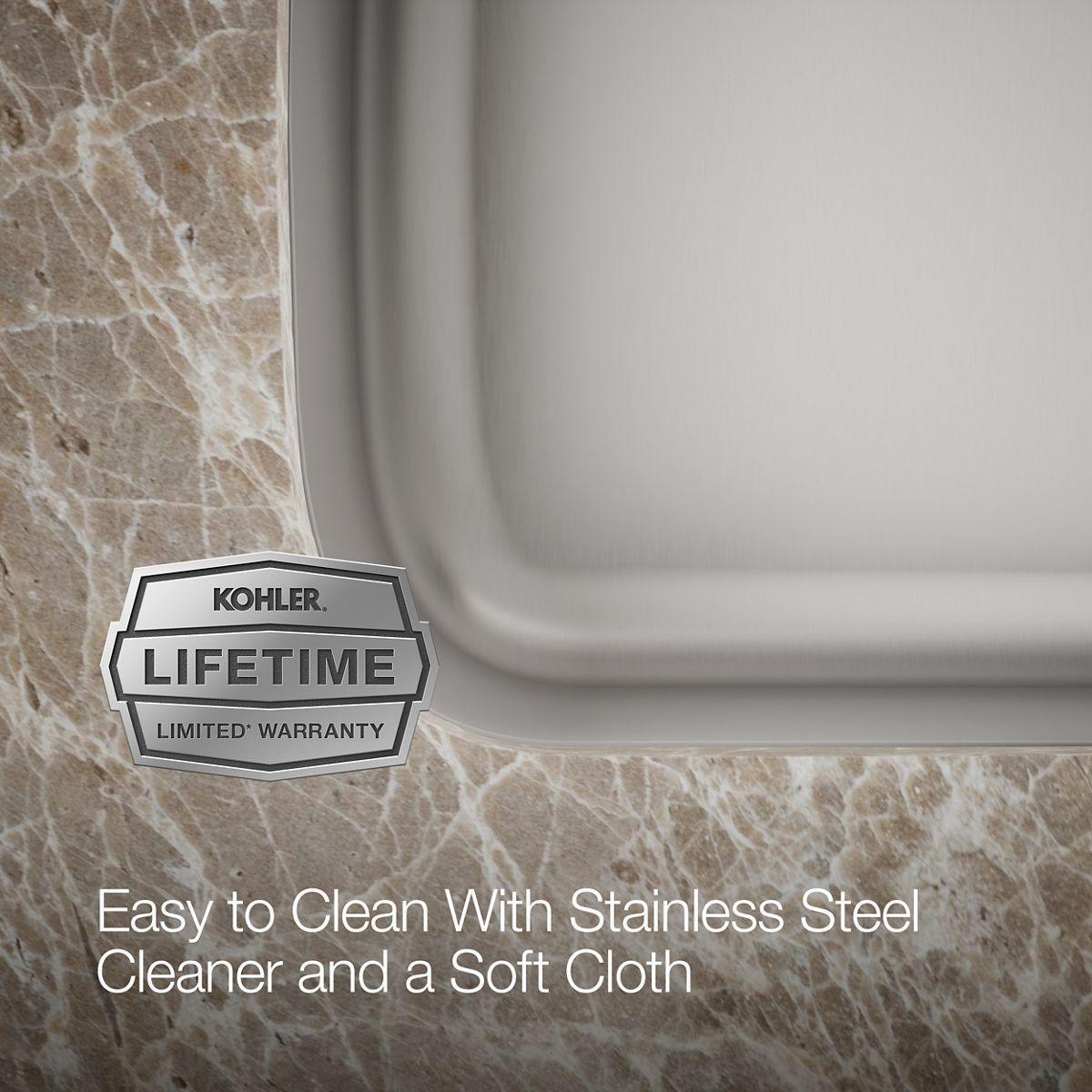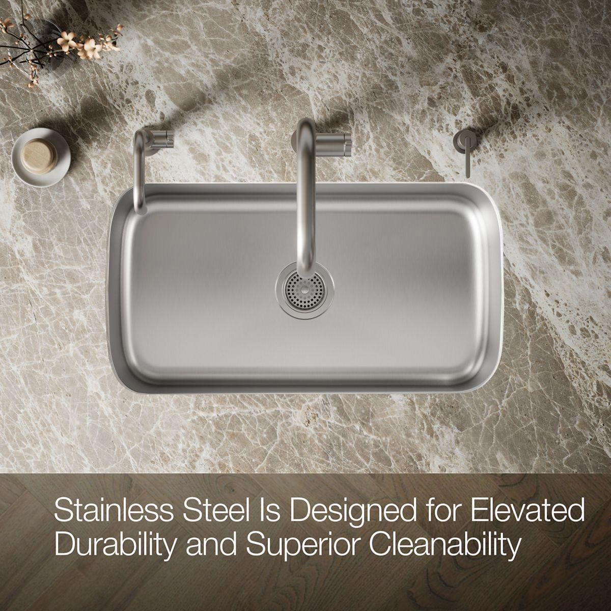 Constructed from premium stainless steel, Undertone brings home the durability, performance, and polished look of professional kitchens. This wide rectangular basin accommodates your largest pots and pans. A mirror-finish edge adds an elegant accent. An engineered sound-absorption system significantly reduces dishwashing and disposal noise.